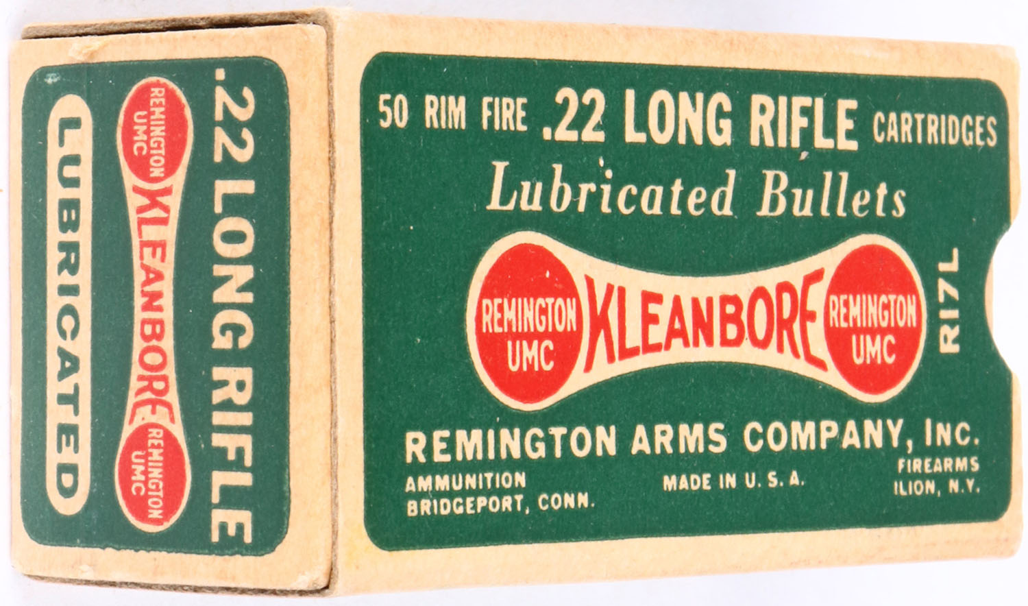 Remington, Kleanbore, .22 Long Rifle, RHWeb: REM-7.2 LR-1j, Full, 1pc. Green white & red dogbone box, box is solid with excellent color, very minor age soiling, corners are sharp, edges are crisp, end flaps are solid, ammo is excellent. Grade: Excellent ++ - Value: 10 to 50