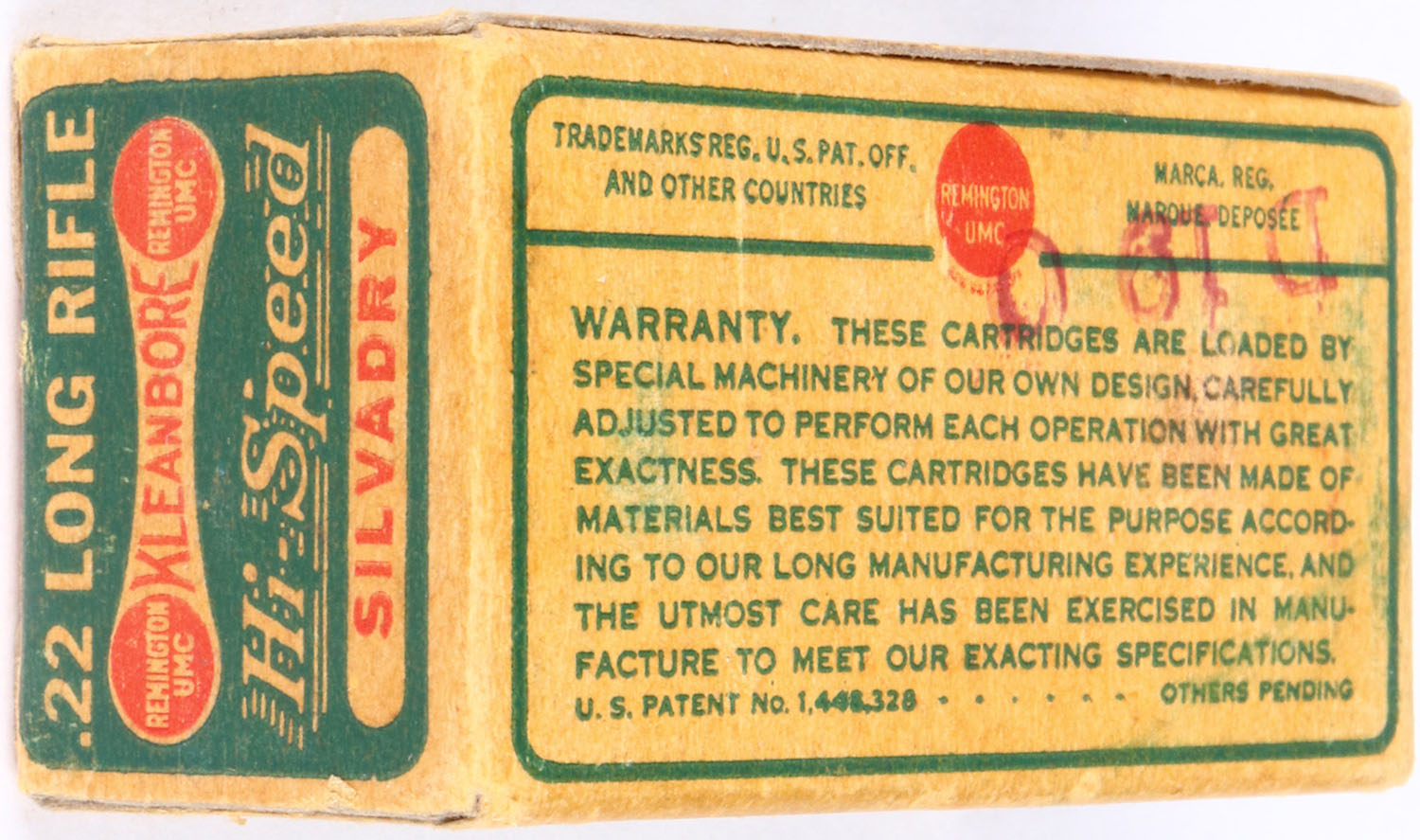Remington, Hi-Speed Silvadry, .22 Long Rifle, RHWeb: REM-7.5 LR-1f, Full, 1pc. Green buff & red dogbone box, box is solid with excellent color, minor age soiling & corner wear, edges are crisp, end flaps are solid, ammo is excellent to minty. Grade: Excellent ++ - Value: 10 to 50