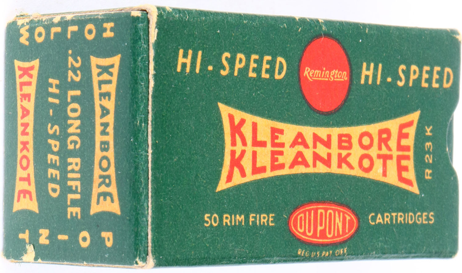 Remington, Kleanbore Kleankote, .22 Long Rifle, Hi-Speed, RHWeb: REM-9 LR-2a, Full, 1pc. Green white & red box, box is solid with excellent color, minor age soiling, very minor corner wear, edges are crisp, end flaps are solid, ammo is excellent. Grade: Excellent + - Value: 20 to 60