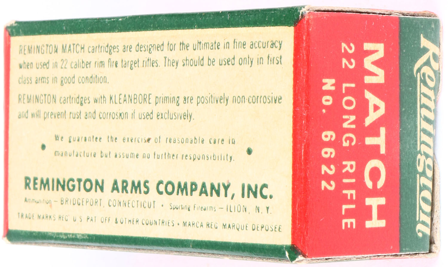Remington, Match, .22 Long Rifle, For Rifle Shooting, RHWeb: REM-54 LR-1a, Full, 1pc. Green red & white box, box is solid with excellent color, only very minor age soiling, corners are mostly sharp, edges are crisp, end flaps are solid, ammo is excellent to minty. Grade: Excellent ++ - Value: 10 to 50