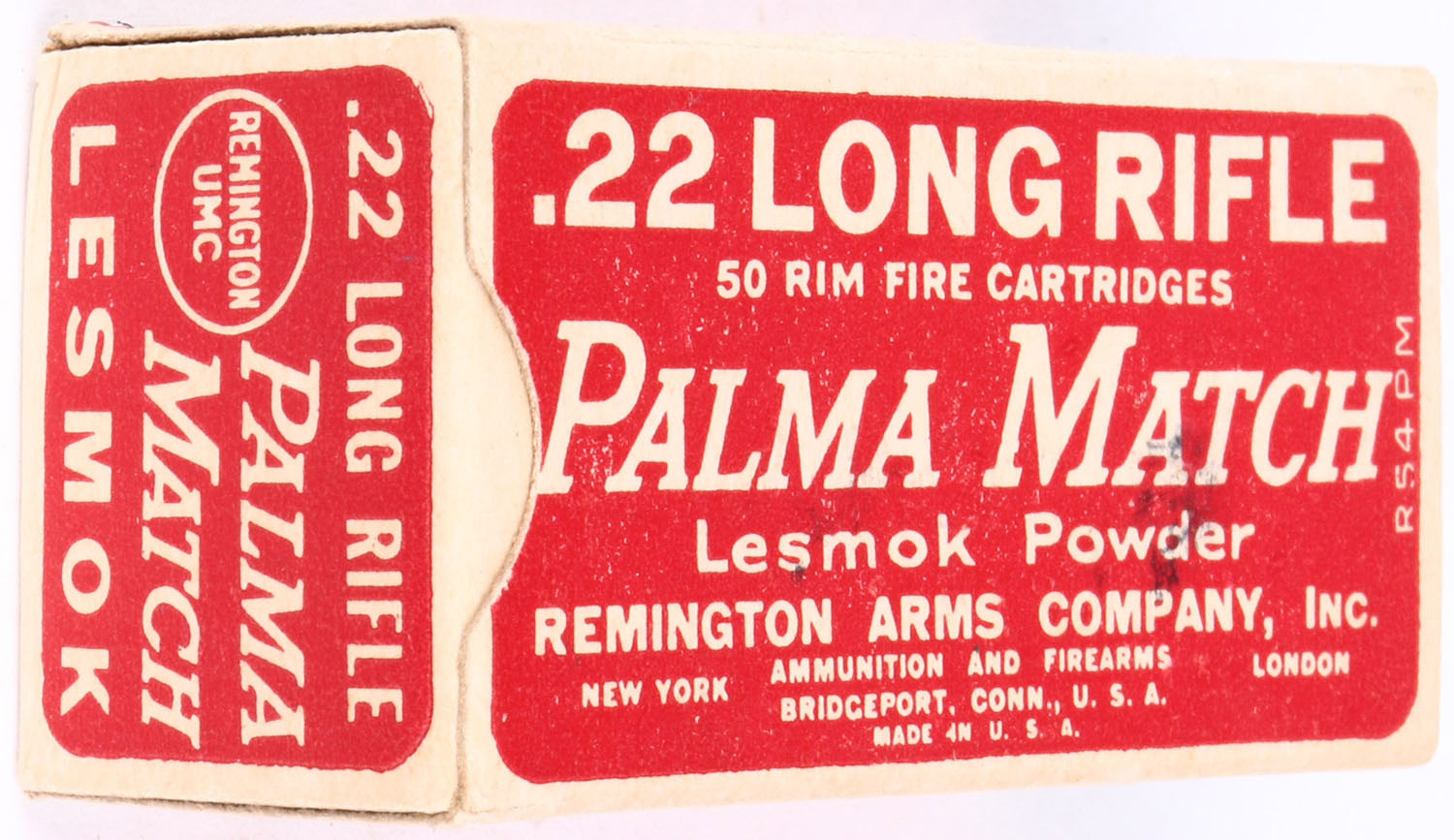 Remington, Palma Match, .22 Long Rifle, RHWeb: REM-52 LR-5a, Full, 1pc. Red & off-white box, box is near mint with minty color, only has one small stain on top, corners are mostly sharp, edges are crisp, end flaps are solid, ammo is very good to excellent. Grade: Excellent ++ - Value: 10 to 50
