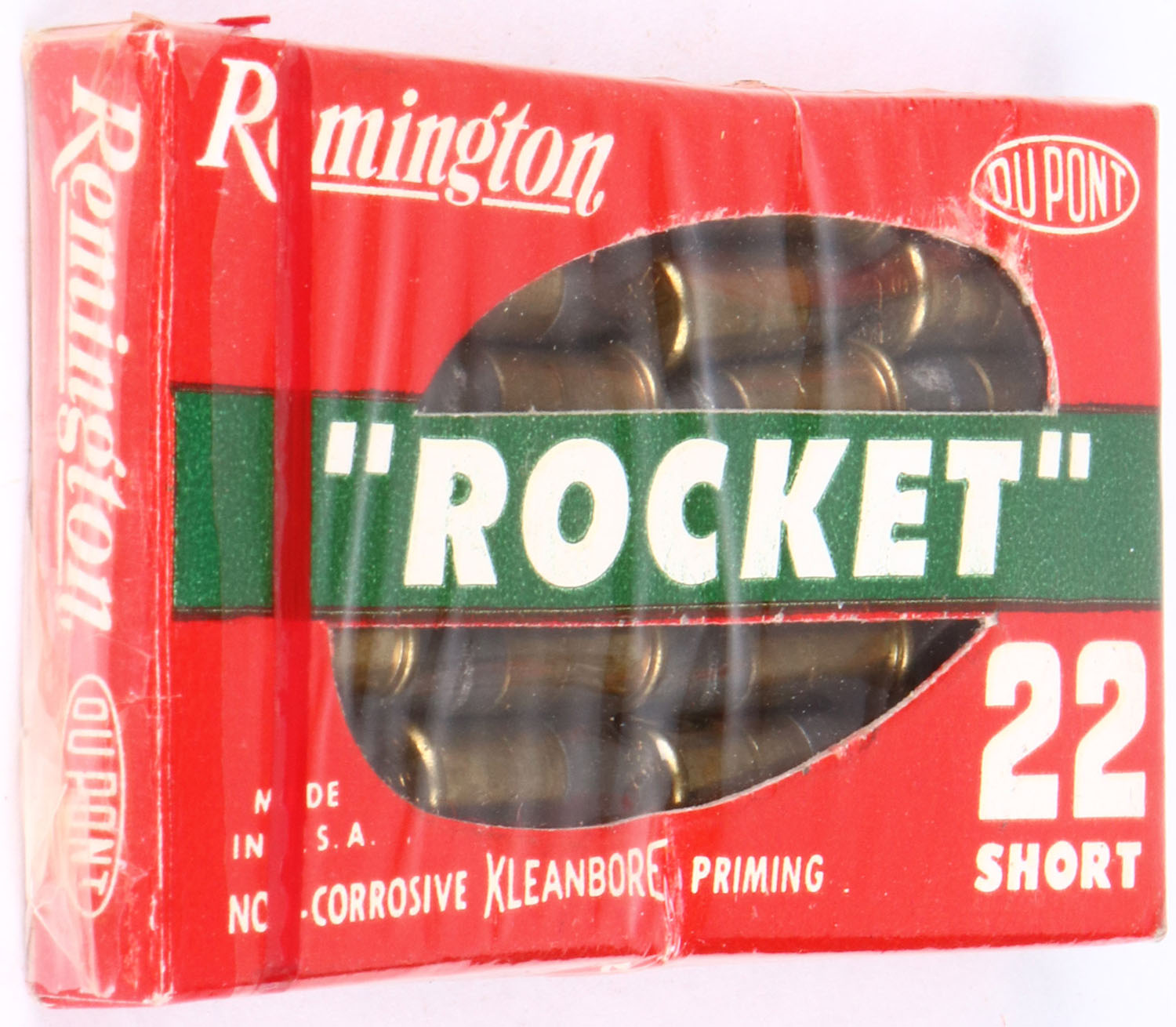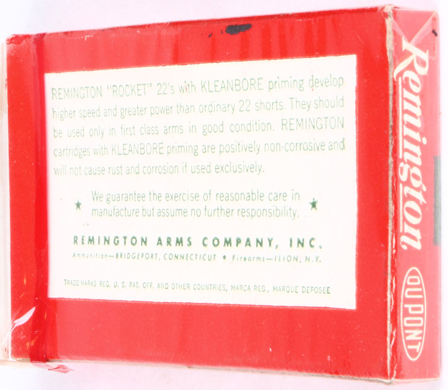 Remington, ''Rocket'', .22 Short, RHWeb: REM-14 S-5, FULL & SEALED, 1pc. Red white & green box, box is near mint with minty color, only has minor deformity - appears to have had something heavy set on it, small tear in clear packaging, corners are sharp, edges are mostly crisp, ammo is mint. Grade: Excellent + - Value: 10 to 50