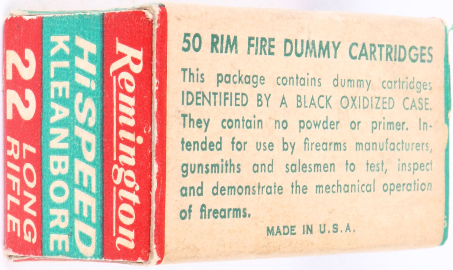 Remington, Hi-Speed Kleanbore, .22 Long Rifle Dummy Cartridges, Not in RHWeb, Full, 1pc. Red green & white box with white & green over label, box is solid with excellent color, some age soiling to top of label, very minor corner wear, edges are crisp, end flaps are solid, ammo is excellent. Grade: Excellent + - Value: 6 to 30
