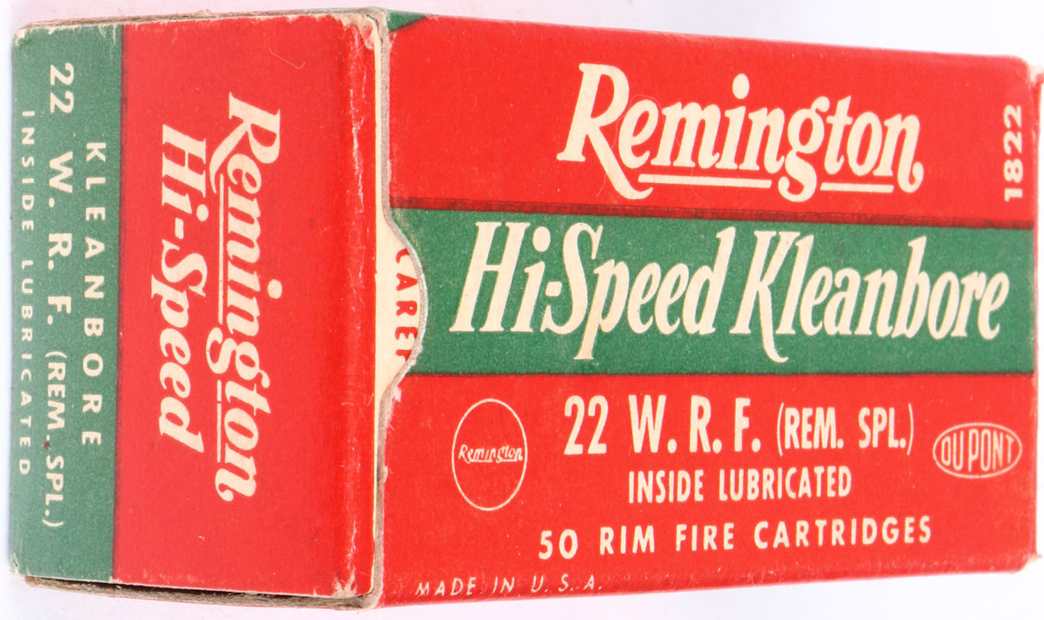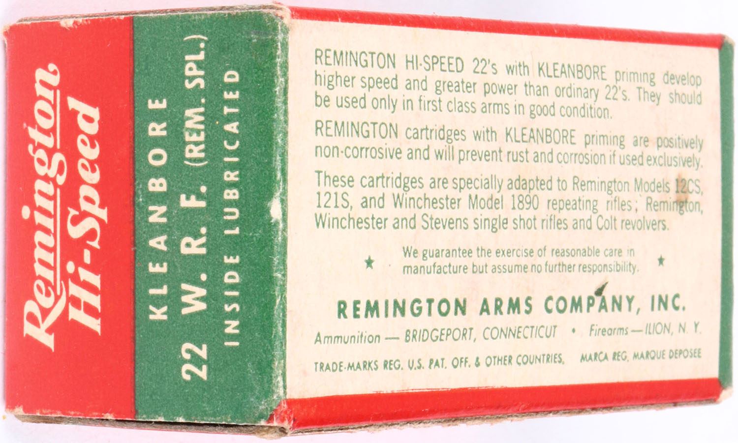 Remington, Hi-Speed Kleanbore, .22 W.R.F. (Rem. Spl.), RHWeb: REM-14 WRF-1a, Full, 1pc. Red green & white box, box is solid with excellent color, only very minor age soiling, corners are mostly sharp, edges are crisp, end flaps are solid, ammo is minty. Grade: Excellent ++ - Value: 10 to 50