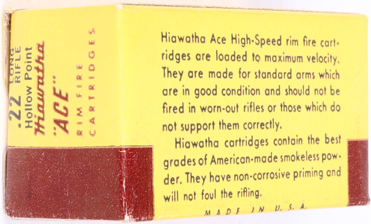Gambles, Hiawatha ''Ace'', .22 Long Rifle Hollow Point, High-Speed, RHWeb: GS-3 LR-2, Full, 1pc. Yellow & brown box, box is solid with excellent color, very minor shelf wear, corners are mostly sharp, edges are crisp, end flaps are solid, ammo is excellent. Grade: Excellent ++ - Value: 10 to 50