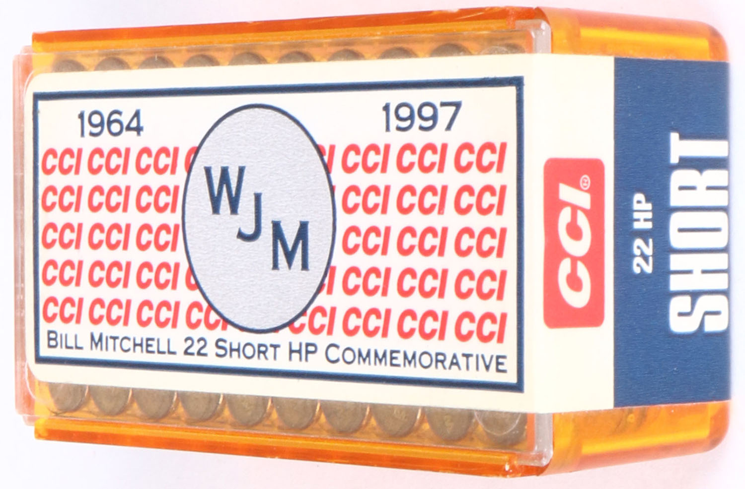 CCI, Bill Mitchell Retirement Commemorative Box, .22 Short Hollow Point, FULL & SEALED, 2pc. Amber & clear plastic tray with white & red sealing label, box is MINT with minty color, label is intact, ammo is excellent to minty. Grade: MINT - Value: 40 to 120