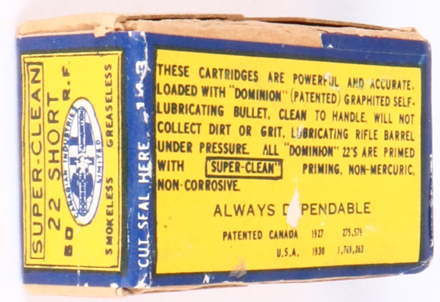 C.I.L., Super-Clean, .22 Short, Smokeless Greaseless, FULL & SEALED, 2pc. Buff box with yellow blue & white wraparound label, box has full seam splits on top and bottom back side edges, very minor shelf wear, on bottom, box has excellent to minty color, corners are sharp, label is intact. Grade: Very Good - Value: 10 to 50