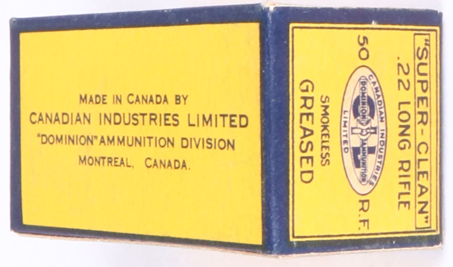 C.I.L., Super-Clean, .22 Long Rifle, Smokeless Greased, Full, 1pc. Yellow blue & white box, box is MINT with minty color, corners are sharp, edges are crisp, end flaps are solid, ammo is excellent. Grade: MINT - Value: 20 to 60
