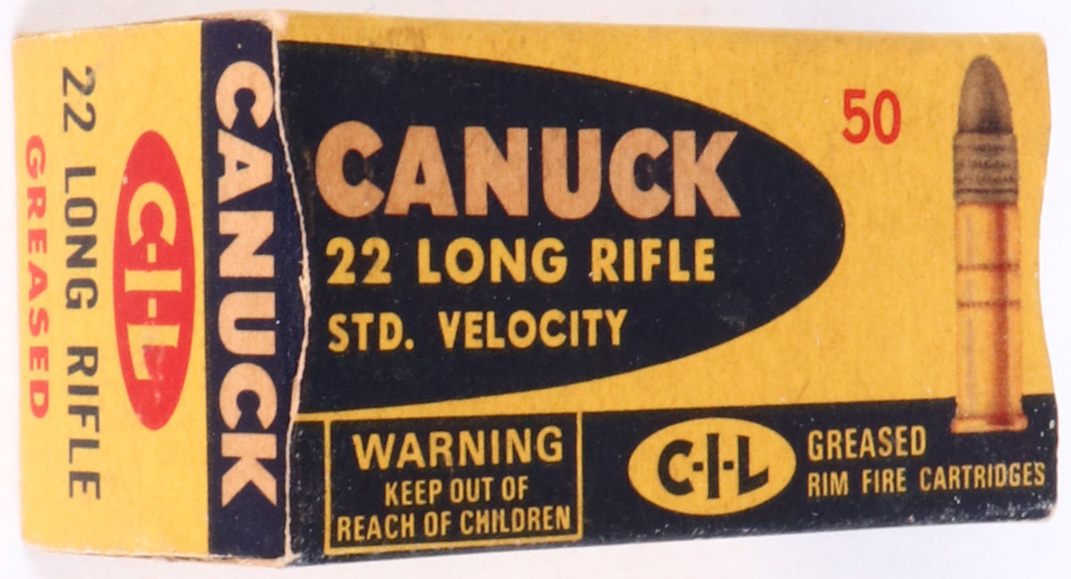 C.I.L., Canuck, .22 Long Rifle, Standard Velocity, Full, 1pc. Yellow & blue box, box is solid with excellent color, minor age soiling, very minor corner wear, edges are crisp, end flaps are solid, ammo is very good to excellent. Grade: Excellent + - Value: 8 to 40