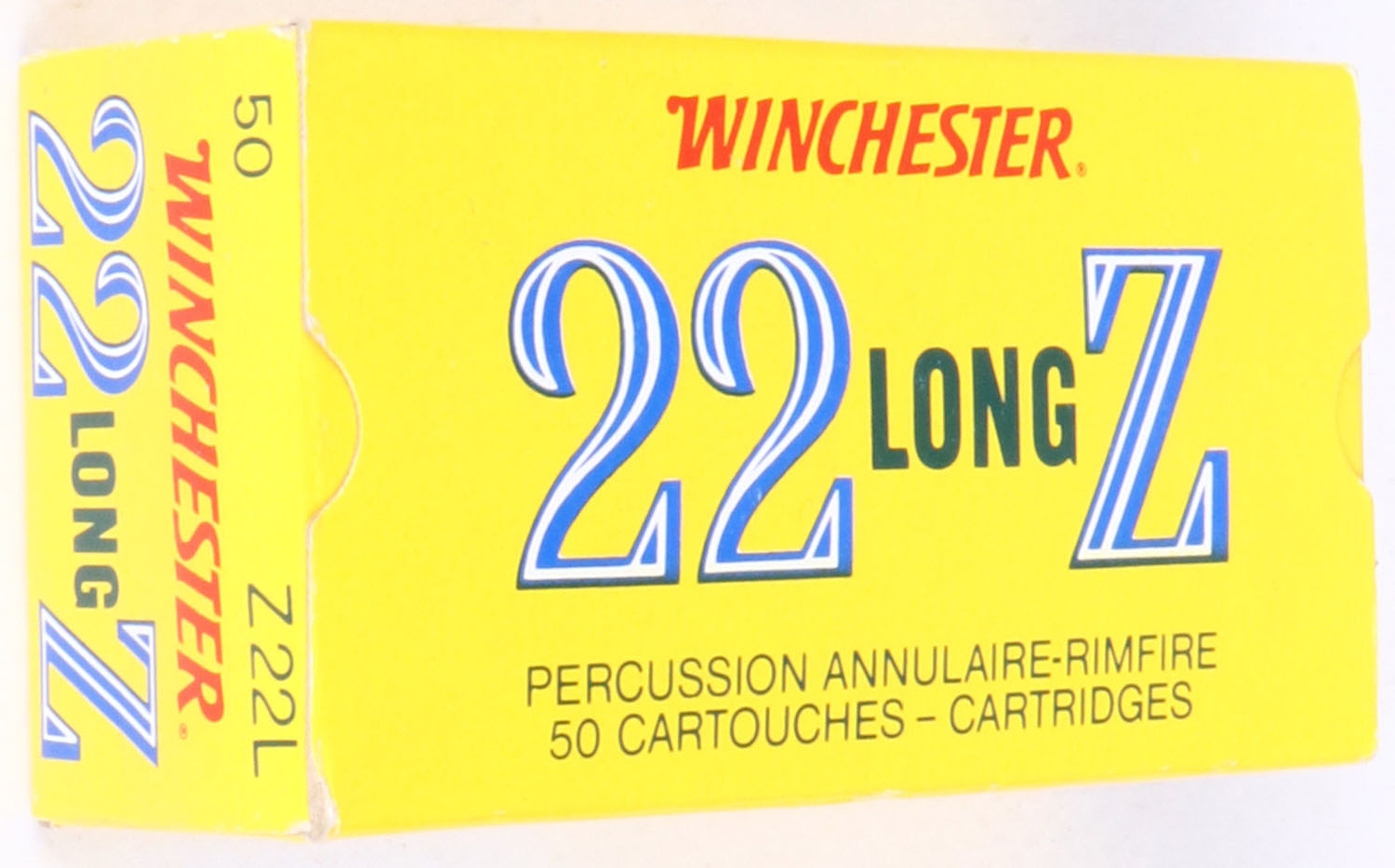 Winchester (Australia), 22 Z, .22 Long, Very Low Velocity, .29gr. Lead Bullet, Full, 1pc. Yellow blue & red box, box is near mint with minty color, only very minor corner wear, edges are mostly crisp, end flaps are solid, ammo is minty. Grade: Excellent ++ - Value: 20 to 60