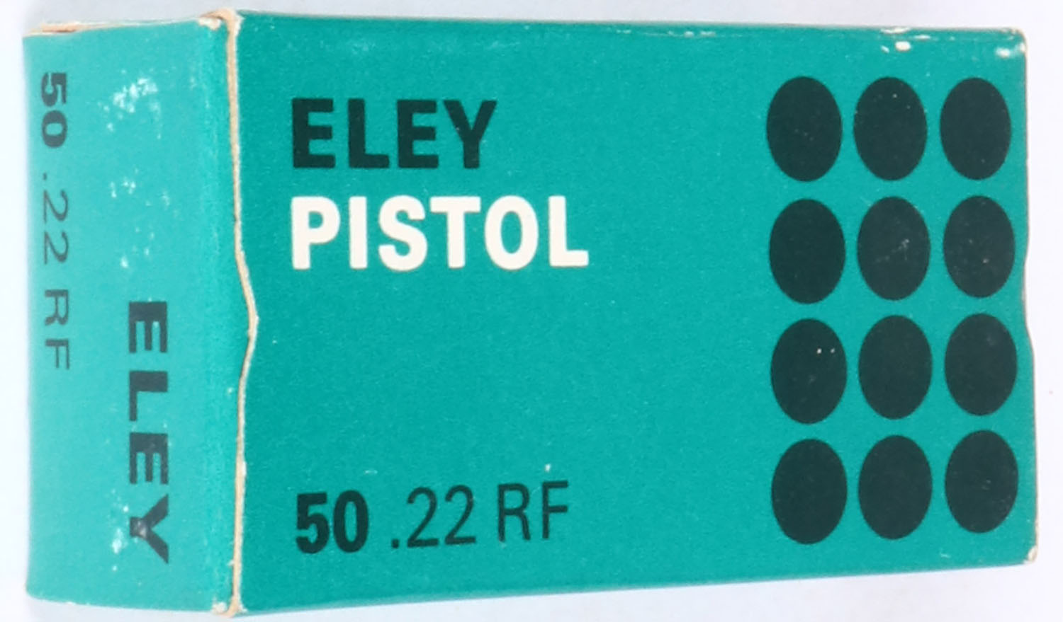 Eley, Pistol, .22 Short, Full, 1pc. Green black & white box, box is solid with excellent to minty color, only very minor shelf & corner wear, edges are crisp, end flaps are solid, ammo is excellent. Grade: Excellent ++ - Value: 10 to 50