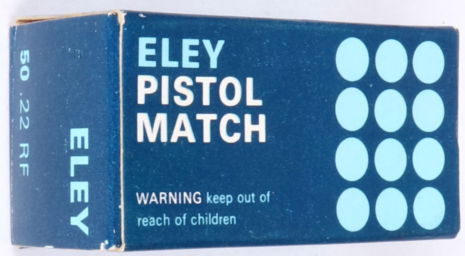 Eley, Pistol Match, .22 Long Rifle, Full, 1pc. Blue turquoise & white box, box is near mint with minty color, only very minor corner wear, edges are crisp, end flaps are solid, ammo is excellent. Grade: Excellent ++ - Value: 10 to 50