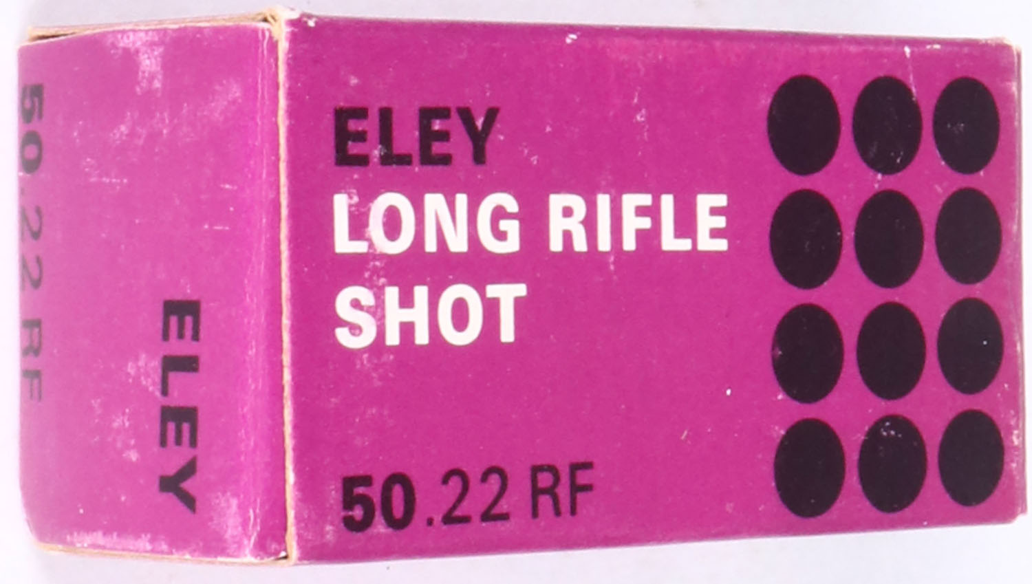 Eley, Long Rifle Shot, .22 Long Rifle Shot, Full, 1pc. Purple black & white box, box is solid with excellent to minty color, only very minor shelf & corner wear, edges are mostly crisp, end flaps are solid, ammo is excellent. Grade: Excellent ++ - Value: 20 to 60