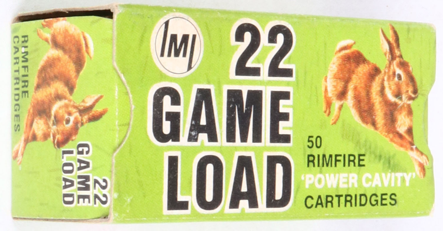 I.M.I., 22 Game Load, .22 Long Rifle, High Velocity, Empty, 1pc. Green white & black box, box is solid with excellent color, some shelf wear, very minor corner wear, edges are crisp, end flaps are solid. Grade: Excellent + - Value: 2 to 20