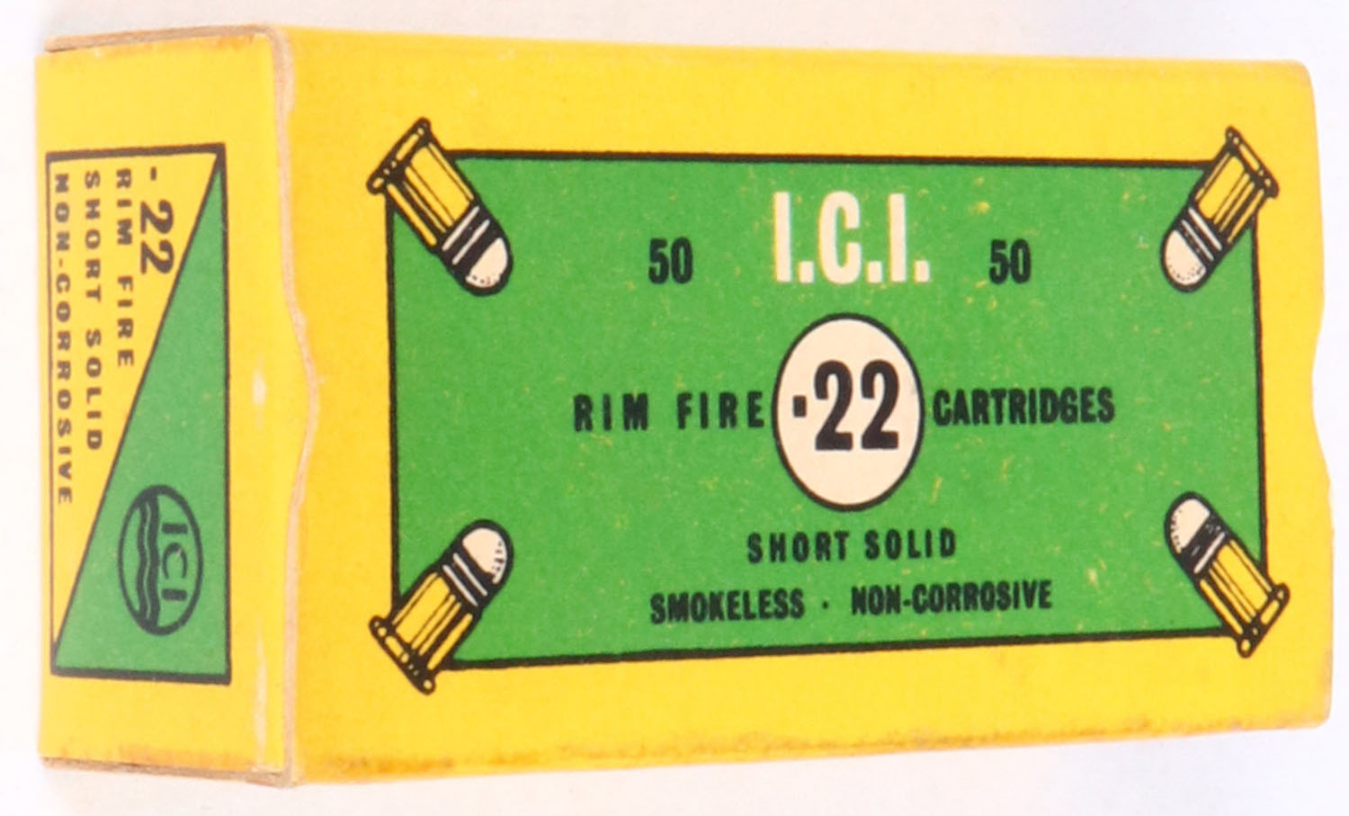 I.C.I., Rim Fire Cartridges, .22 Short, Non-Corrosive, Full, 1pc. Green & yellow box, box is solid with excellent color, very minor shelf wear, corners are sharp, edges are crisp, end flaps are solid, ammo is excellent. Grade: Excellent ++ - Value: 10 to 50