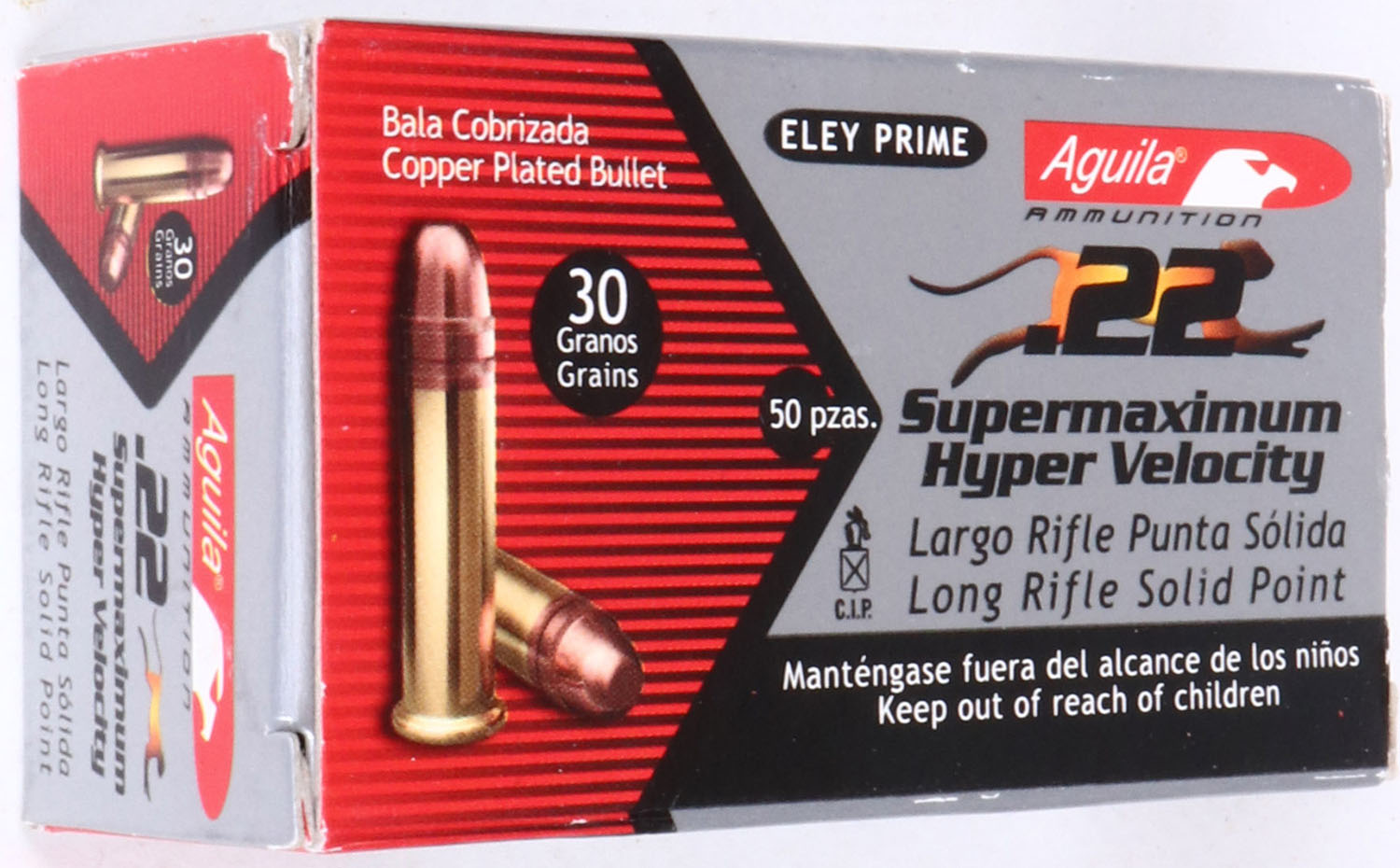 Aguila, Supermaximum, .22 Long Rifle, Hyper Velocity, Full, 1pc. Silver red & black box, box is near mint with minty color, only very minor wear on right end flap, corners are sharp, edges are crisp, end flaps are solid, ammo is mint. Grade: MINT - Value: 6 to 30