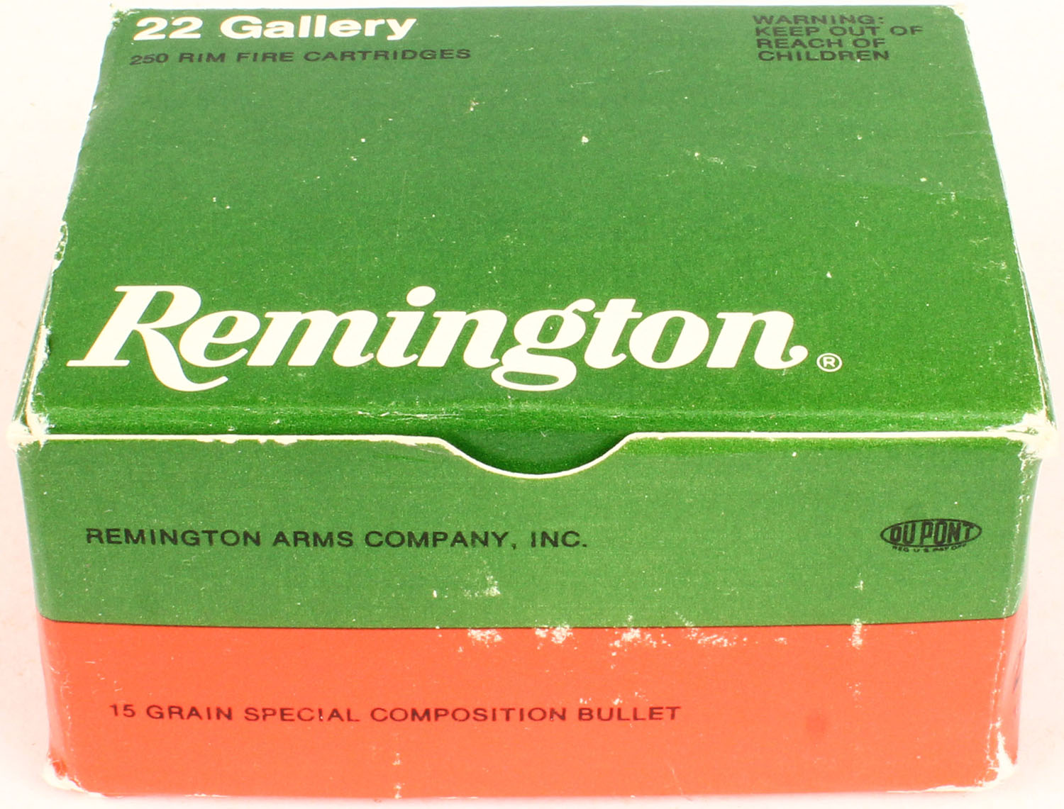 Remington, 22 Gallery, .22 Short, Gallery, Spatter-Less, 250rds., 1pc. Green red & white bulk box, box is solid with minty color, very minor shelf wear, some corner wear, edges are crisp, top flap is solid, ammo is minty. Grade: Excellent + - Value: 10 to 50
