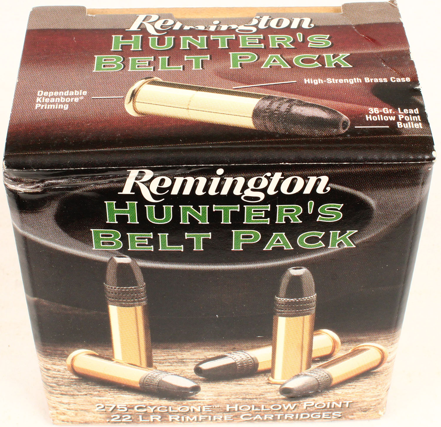 Remington, Hunter's Belt Pack, 22. Long Rifle, Cyclone Hollow Point, Full, 275rds., 1pc. Multi-colored bulk box, box is near mint with minty color, only one corner ding on top front corner, corners otherwise sharp, edges are crisp, top flap is solid, ammo is mint. Grade: Excellent ++ - Value: 10 to 50