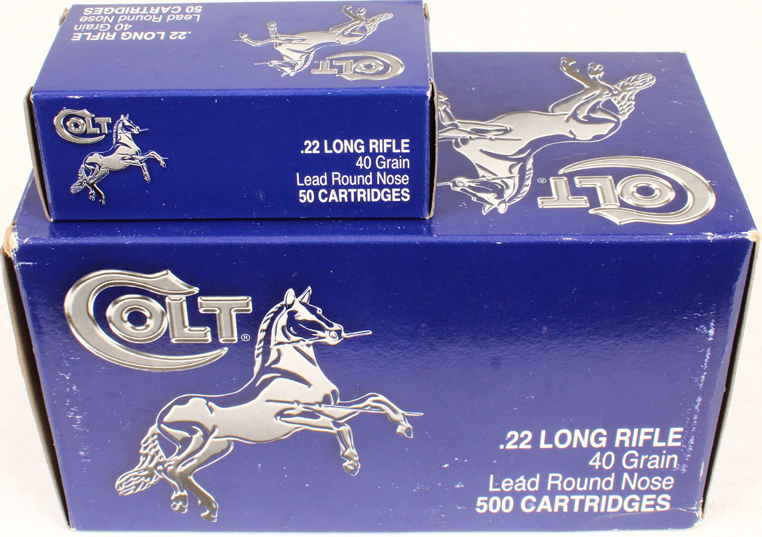 Aguila, Colt, .22 Long Rifle, 40 Grain Lead Round Nose, Full, 500rds. 1pc. Blue & silver brick, brick is solid with minty color, only very minor shelf & corner wear, edges are crisp, end flaps are solid, inside boxes are mint. Grade: Excellent ++ - Value: 200 to 400