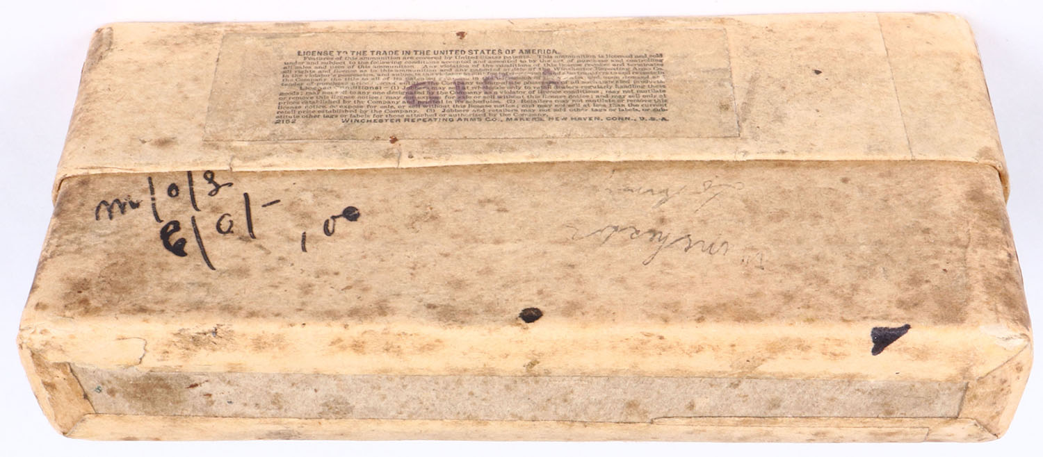 Winchester, .45-90 High Velocity, Low pressure smokeless powder, 300 Gr. Metal patched Bullet, 2pc, Full, buff box with purple label & black print, box is solid with light age soiling, light scuff marks & top label, light rub marks & light edge wear, corner & edges are solid, ammo is good. Grade: Very Good ++ - Value: 800 to 1600