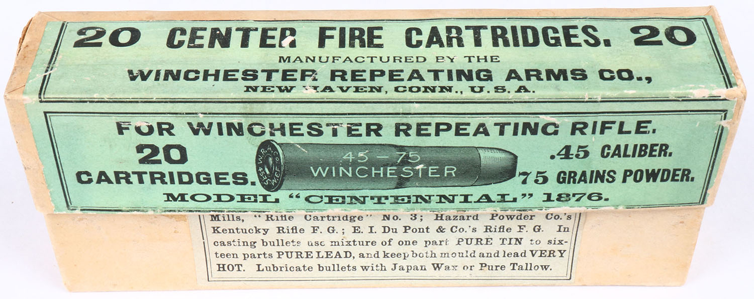 Winchester, .45-75, Model ''Centennial'' 1876, Full, 2pc. Buff box with green label & black print, box has very good color, light rub marks & light edge wear, ammo is excellent. Grade: Excellent ++ - Value: 200 to 600