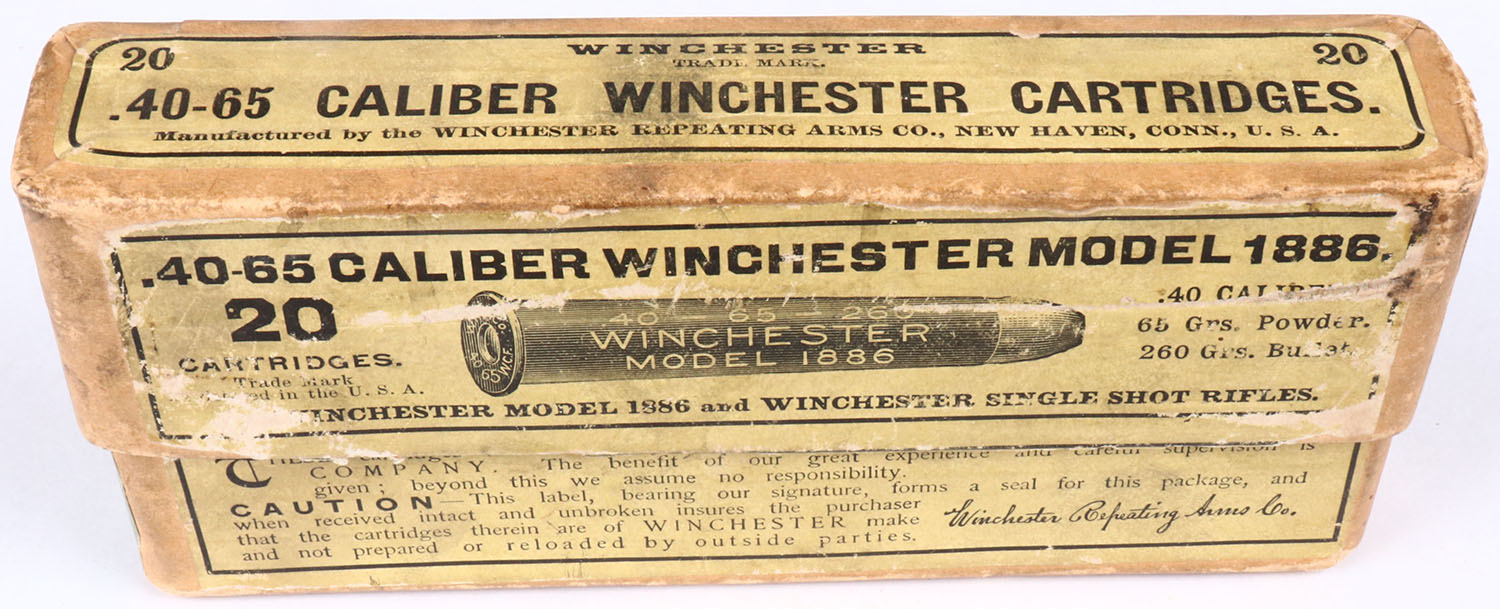 Winchester, .40-65, 260 Gr. Bullet, 2pc, Full, buff box with green(faded yellow) label & black print, box is solid with light age soiling, pen marks, rub marks, & edge wear, ammo is very good. Grade: Excellent - Value: 100 to 300