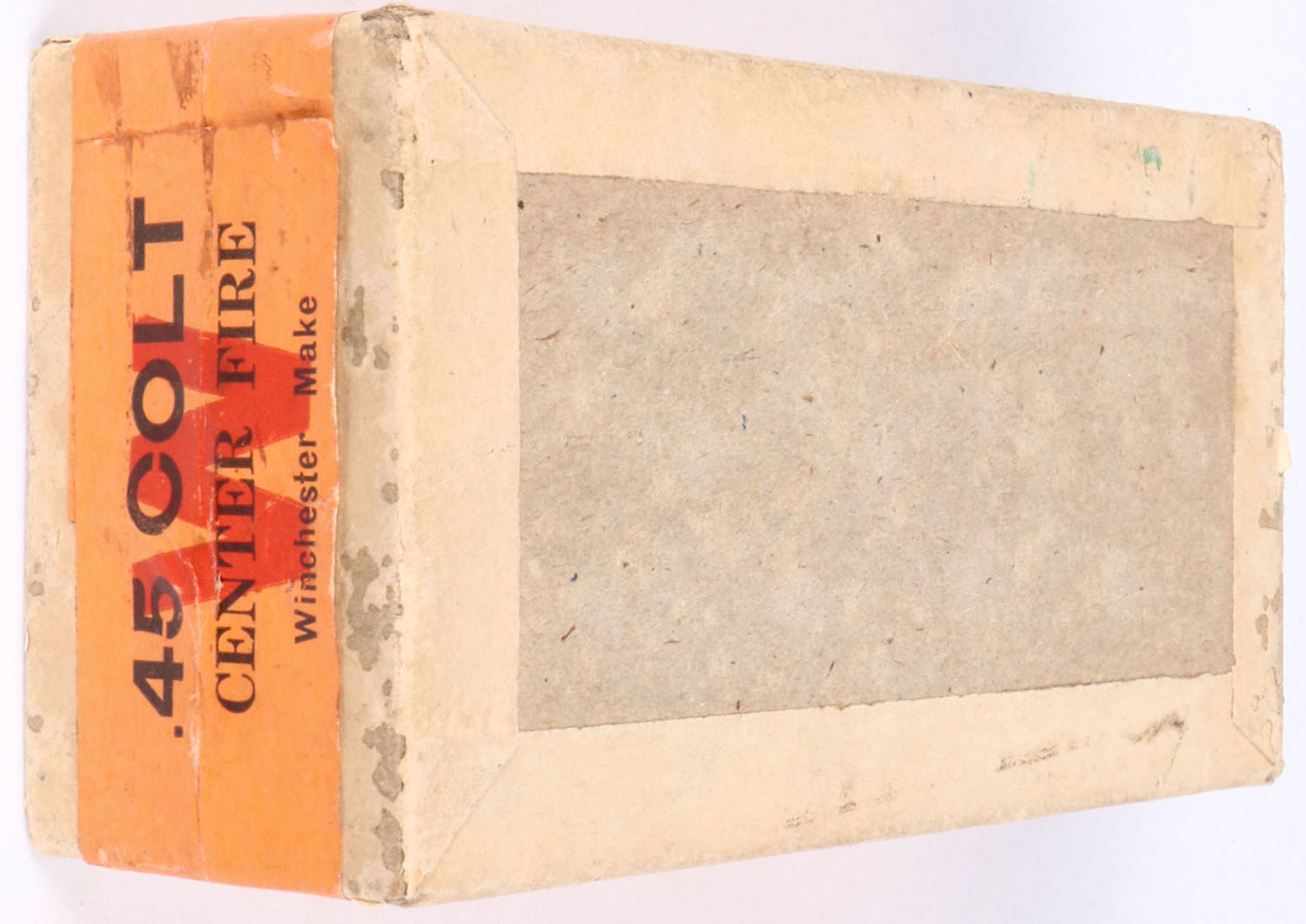 Winchester, .45 Colt, 2pc, FULL & SEALED, buff box with green/orange label & black print, box is solid with stain on front label, rub marks, & edge wear. Grade: Excellent - Value: 100 to 300