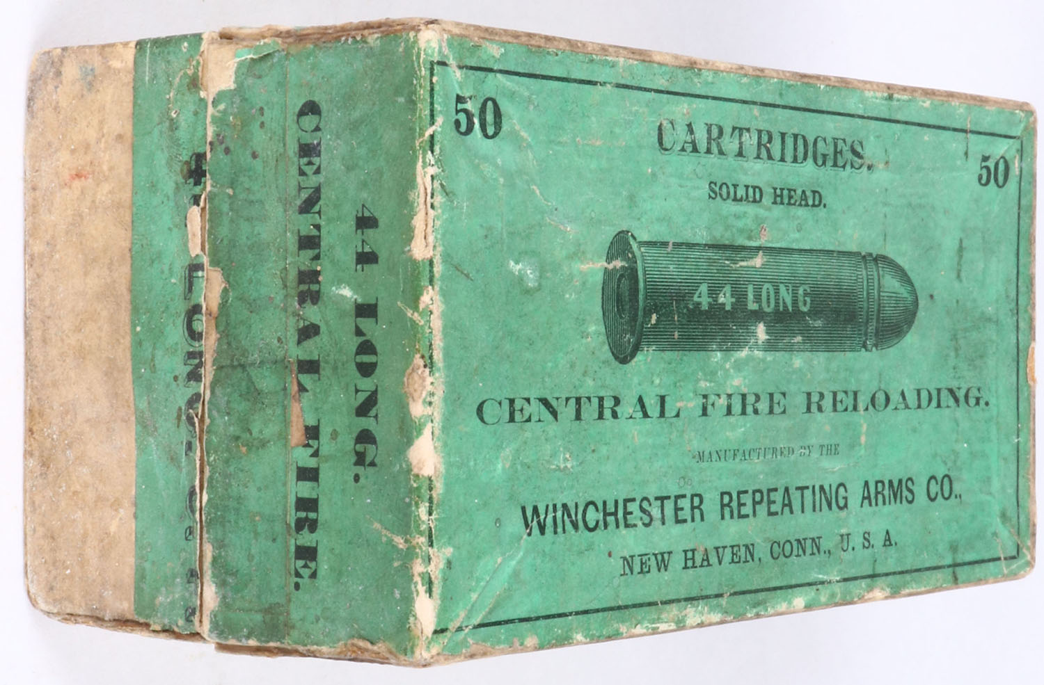 Winchester, 44 Long C.F., Central Fire Reloading, 2pc, Full, buff box with green label & black print, box is solid with light age soiling, rub marks & edge wear, ammo is poor. Grade: Very Good ++ - Value: 100 to 200