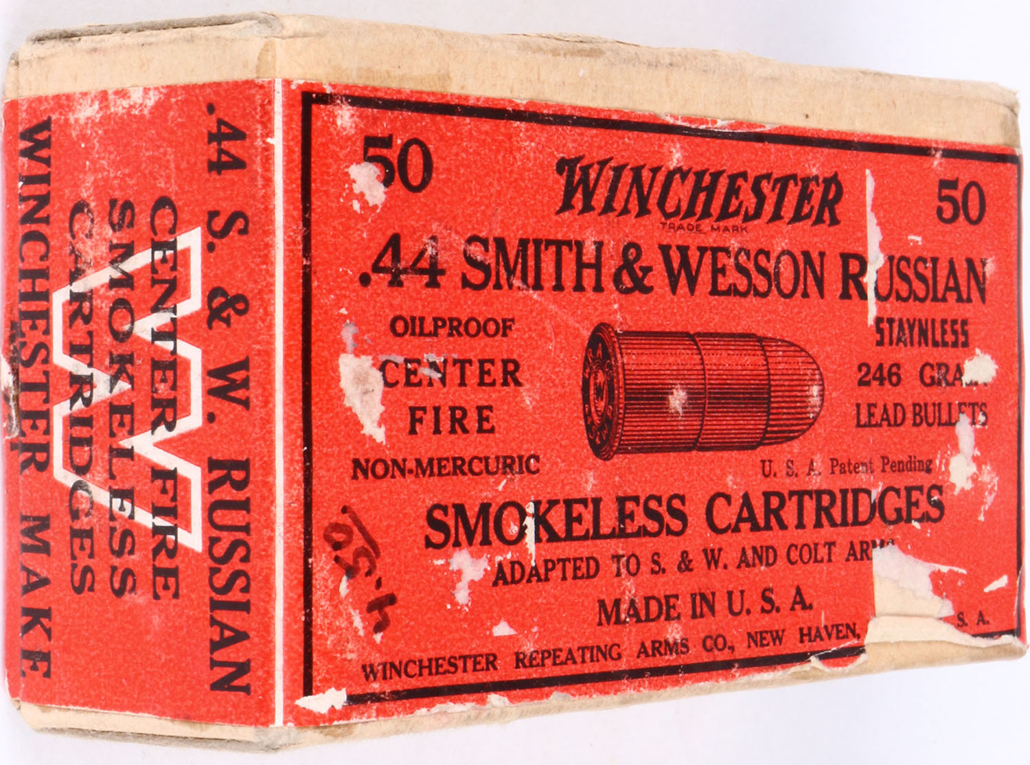 Winchester, .44 Smith & Wesson Russian, Staynless, 246 Grain Lead Bullet, FULL & SEALED, 2pc. Buff box with red wraparound label & black print, box is solid with excellent color, box is solid with pen/pencil marks, small tears in top label, rub marks, & edge/corner wear. Grade: Excellent - Value: 50 to 200