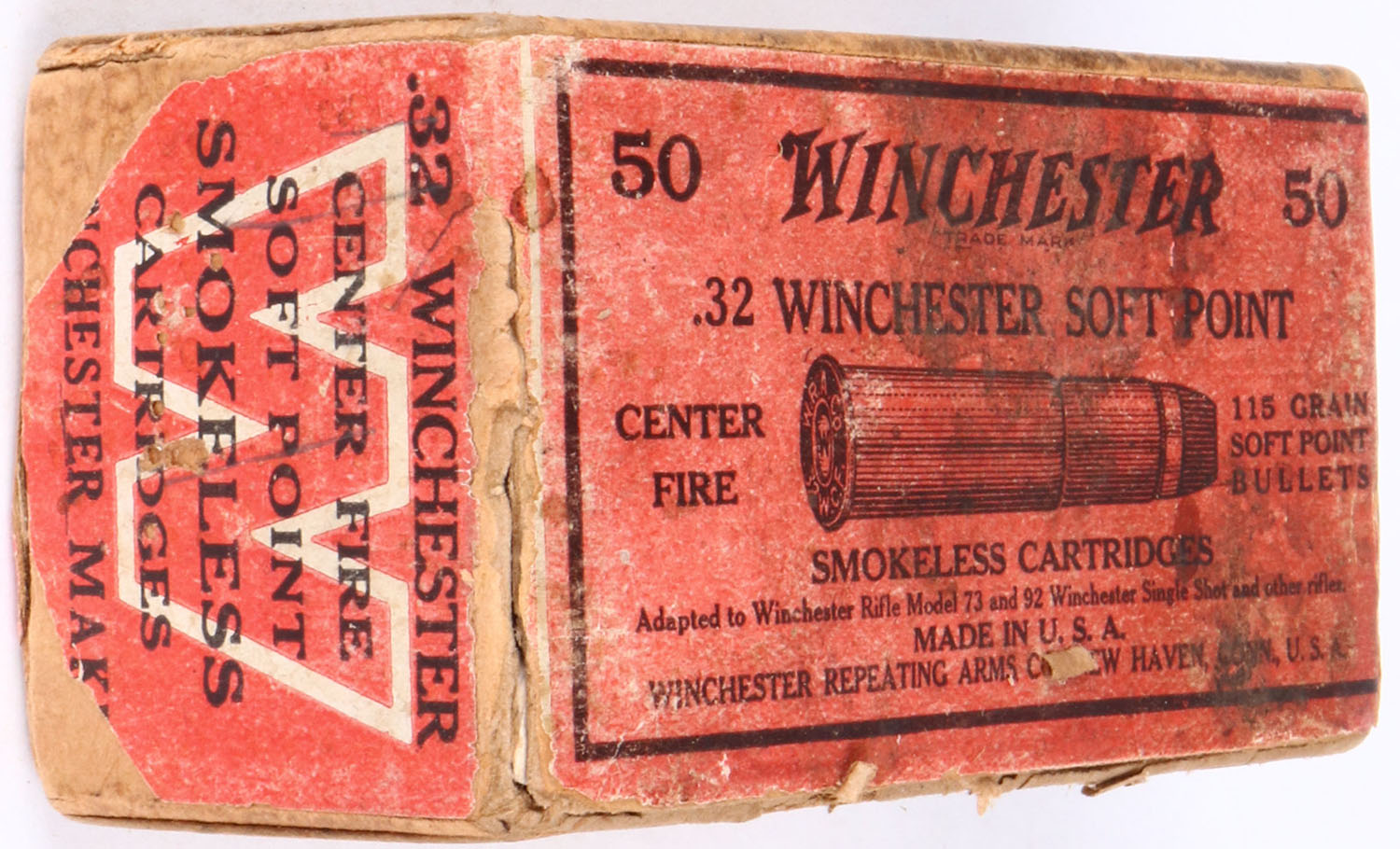 Winchester .32 Winchester Soft Point, Smokeless, 115 Gr. Soft point, , 2 Pc., partial 15 Rds., buff box with orange label & black print, box has four split seams, age soiling, light rub marks & edge wear, ammo is good. Grade: Very Good - Value: 50 to 100