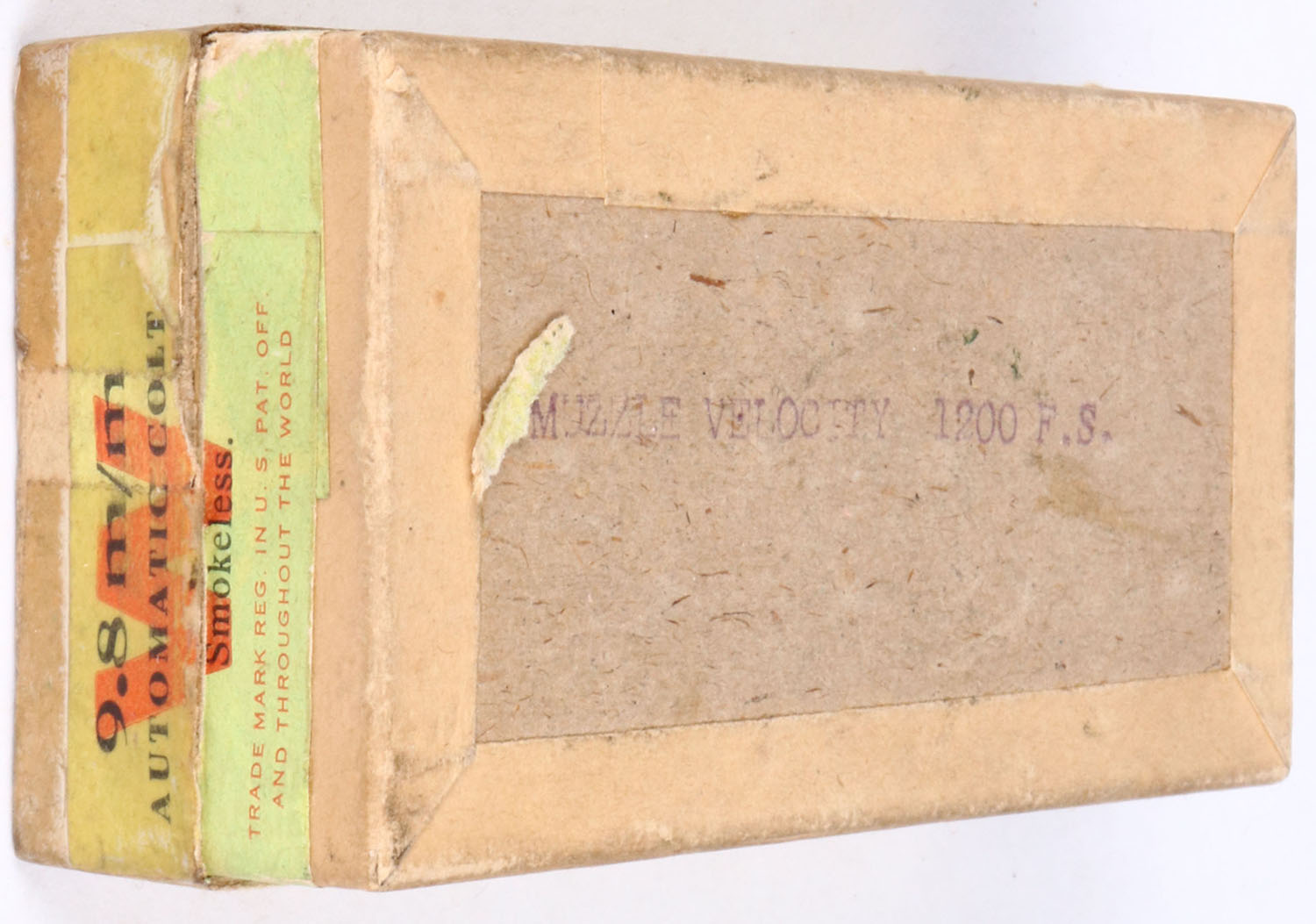 RARE!! Winchester, 9.8mm Automatic colt, Smokeless, 130 Gr. Patched bullet, made only in 1910-1911, 2pc, Full, buff box with orange/green label & black print, box is missing the left end flap on lid, tape repairs on two corner seams on lid, light age soiling, rub marks, & edge wear, ammo is very good.* Grade: Very Good + - Value: 800 to 1200