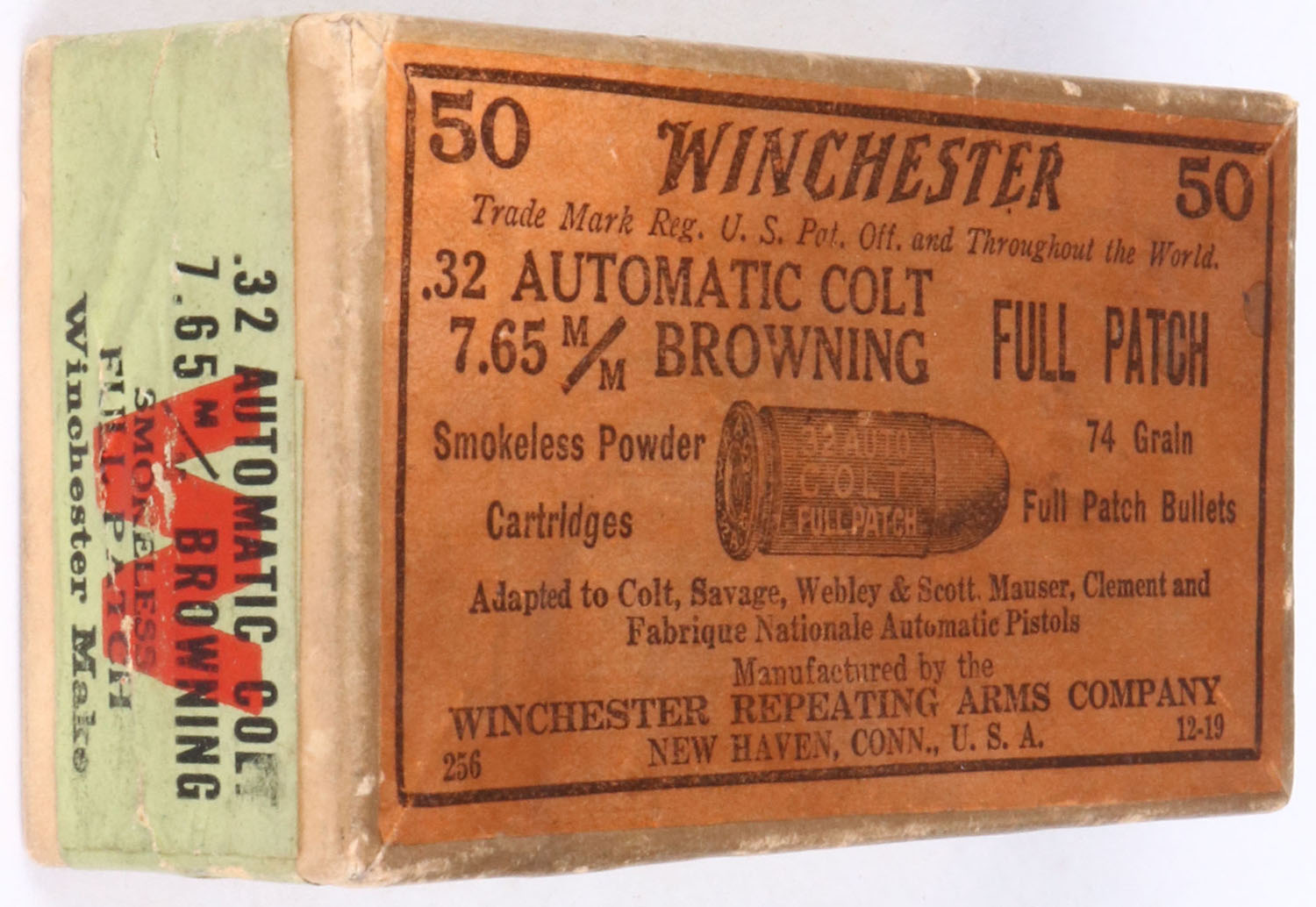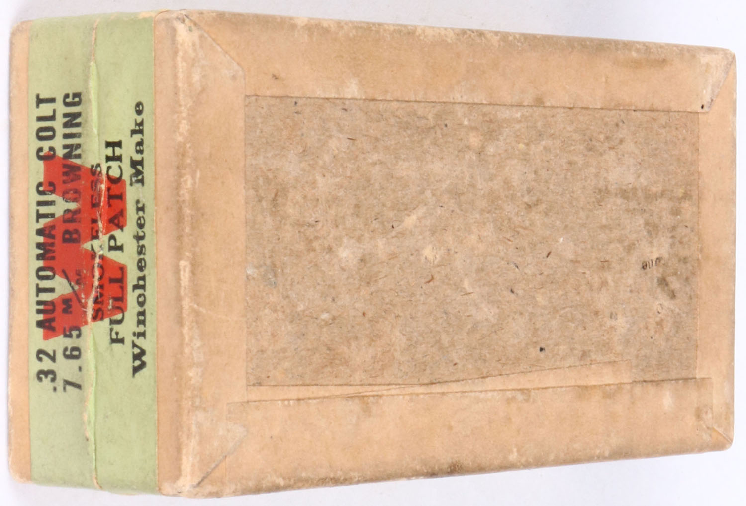 Winchester, .32 Automatic Colt, 7.65mm Browning, Smokeless Powder, 74 Grain Full Patch Bullets, FULL & SEALED, 2pc. Buff box with orange top & green side sealing labels, box is solid with light fading on top label, minor rub marks, & light edge wear. Grade: Excellent + - Value: 40 to 100
