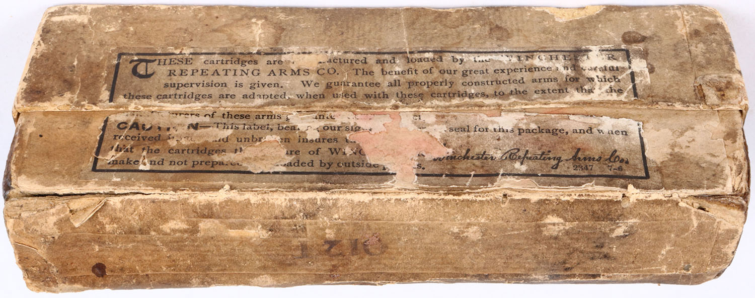 Winchester, .50-95, 20 Central Fire Express Cartridges, For Winchester Repeating Rifle, 2pc., Full, Buff box with black printing,, box has seam split on bottom right end from front to back, seam split on front of lid has been glued from the inside, age soiling, edge wear, ammo is excellent. * Grade: Very Good - Value: 700 to 1200
