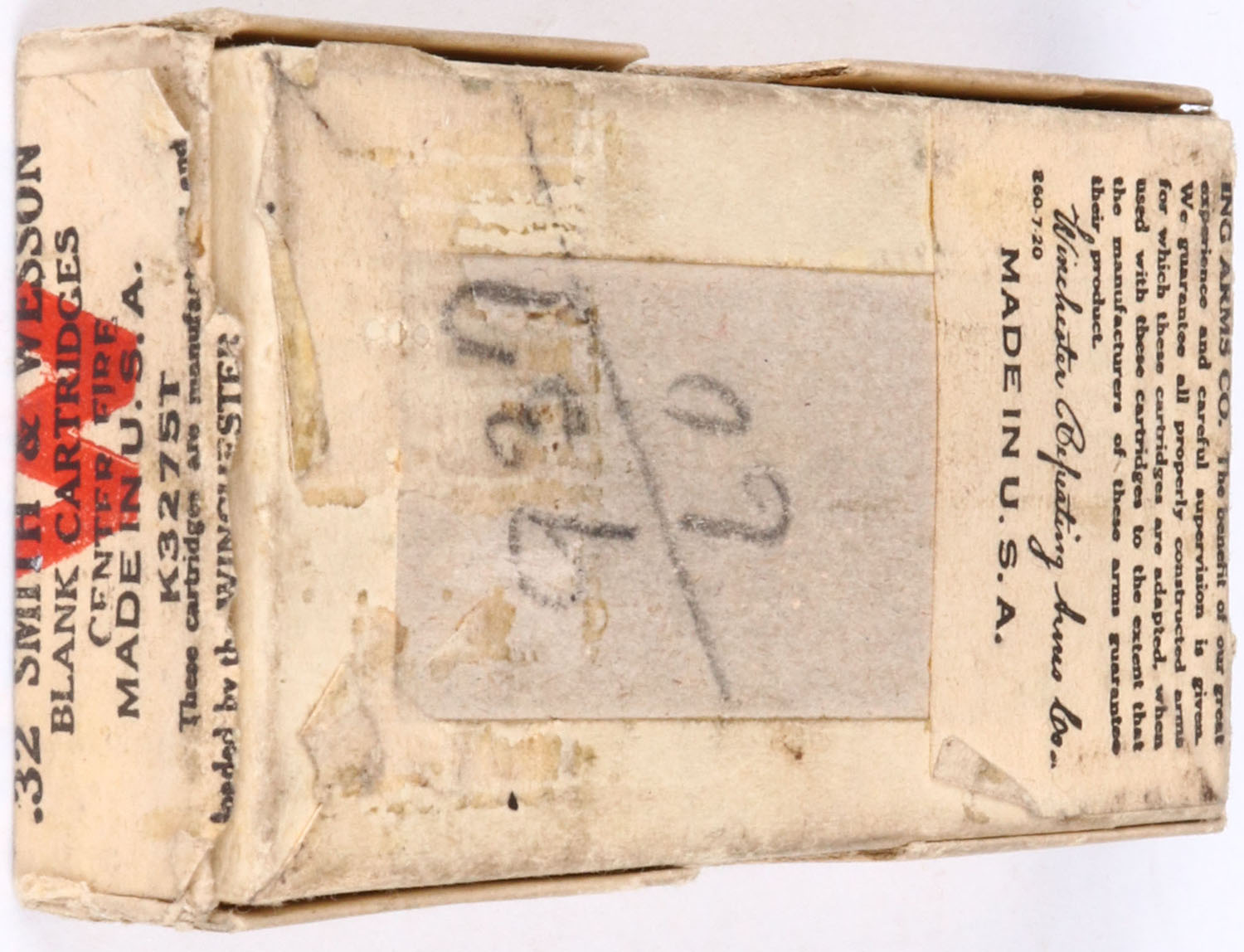 Winchester, .32 Smith & Wesson Blank Cartridges, Partial 46 Rds., 2pc. Buff box with buff wraparound label, box has three corner seam splits on lid, light age soiling, minor rub marks & light edge wear, ammo is very good to good. Grade: Very good ++ - Value: 10 to 30