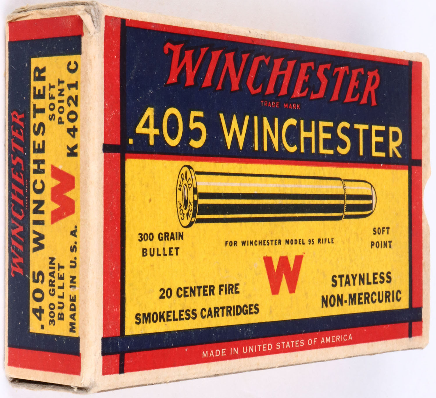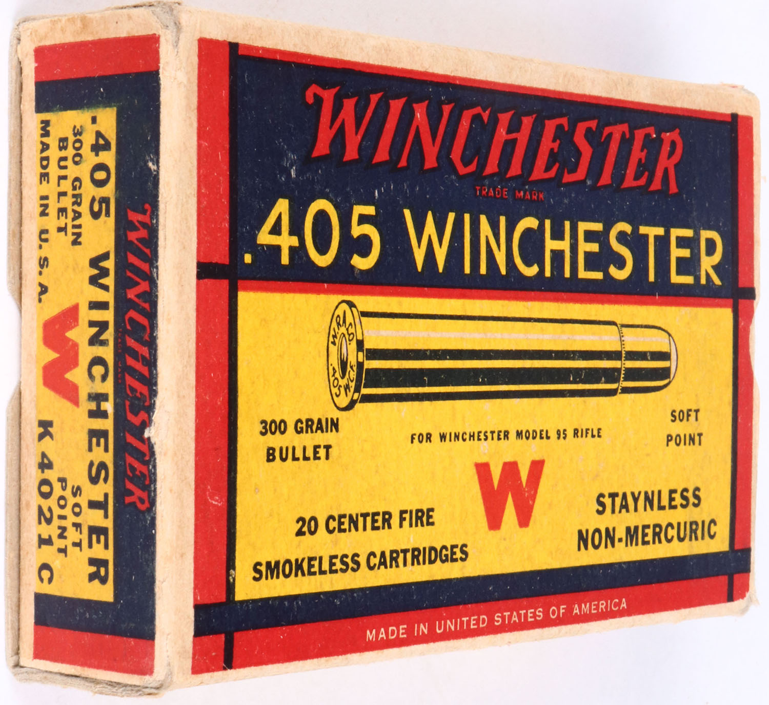 Winchester, .405 Winchester, 300 Gr. Soft point Bullet, 1pc, Full, white box with blue/yellow/red label & red/black/white print, box is solid with very good color, minor age soiling, light rub marks, & minor edge wear, ammo is very good to good. Grade: Excellent + - Value: 50 to 150
