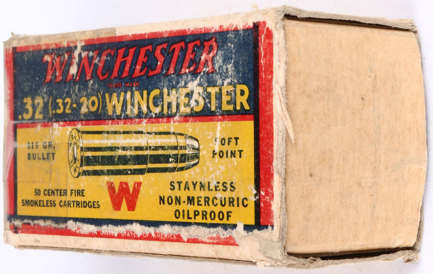 Winchester, .32-20 Winchester, 115 Gr. Soft point Bullet, 1pc, Full, white box with blue/yellow/red label & red/black/white print, box is missing right end flap, left end flap is taped on, heavy rub marks, & heavy edge wear, ammo is very good to excellent. Grade: Very Good - Value: 30 to 150