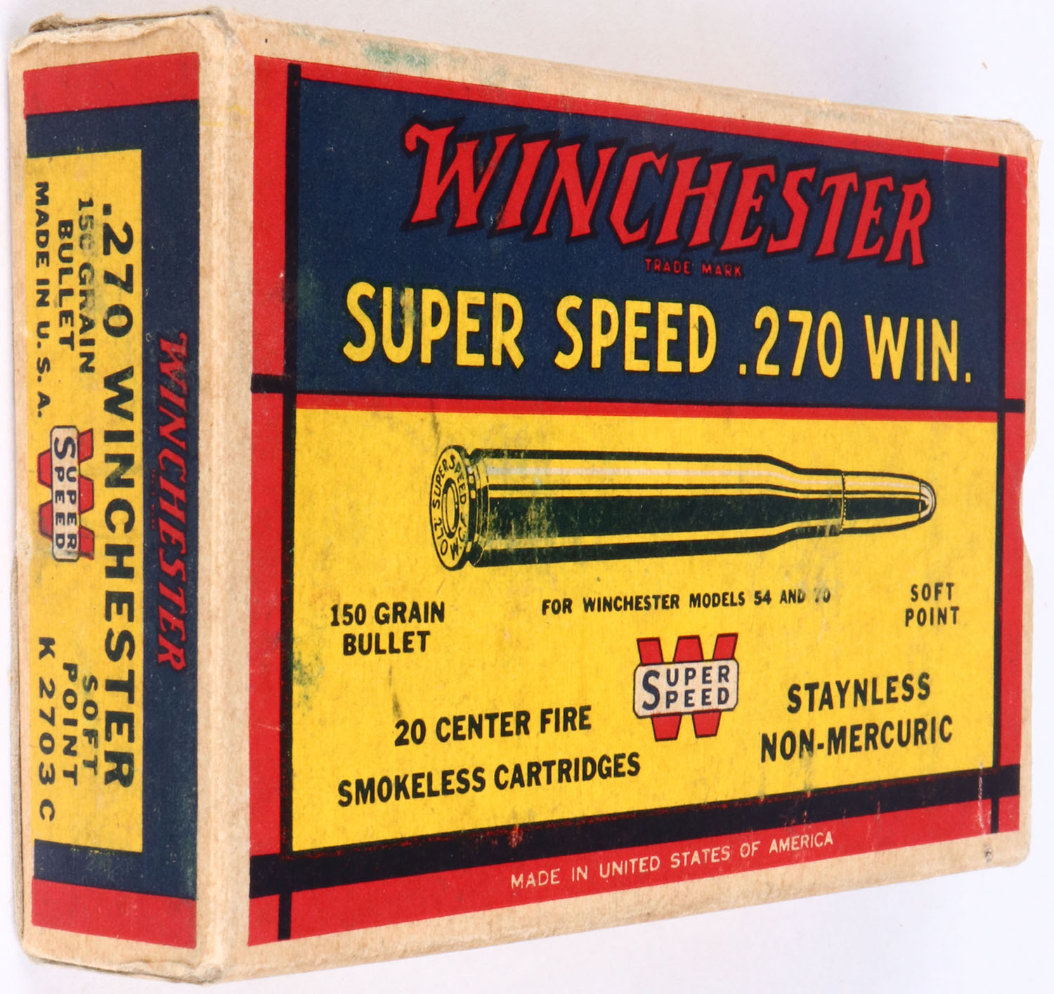 Winchester, .270 Win, Super Speed, 150 Gr. Soft point Bullet, 1pc, Full, white box with blue/yellow/red label & red/black/white print, box has one partial split seam, light age soiling, light rub marks & light edge wear, ammo is excellent. Grade: Very Good ++ - Value: 20 to 60