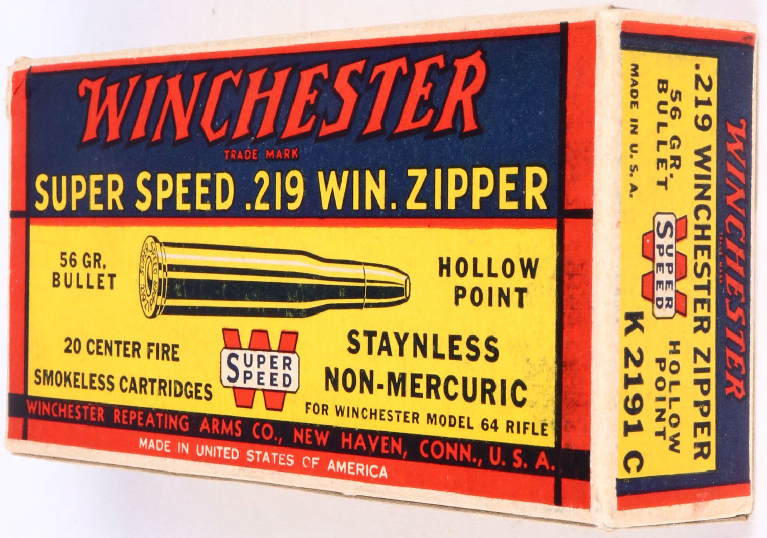 SCARCE & EARLY!! Winchester, .219 Win. Zipper, Super Speed, 56 Gr. Hollow point Bullet, Early 1938 Box, 1pc, Full, white box with blue/yellow/red label & red/black/white print, box is solid with excellent color, minor handling wear, & minor rub wear, ammo is excellent. Grade: Excellent ++ - Value: 400 to 1000