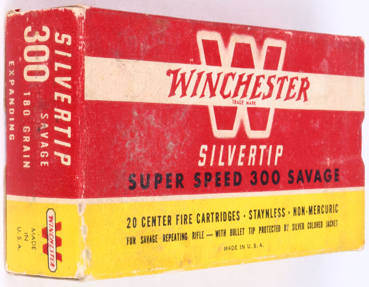 Winchester, Silvertip, .300 Savage, Super Speed, 180 Gr. Bullet, 1pc, Full, red & yellow box with white & black print, box is solid with rub marks, & edge wear, ammo is excellent. Grade: Excellent - Value: 30 to 60