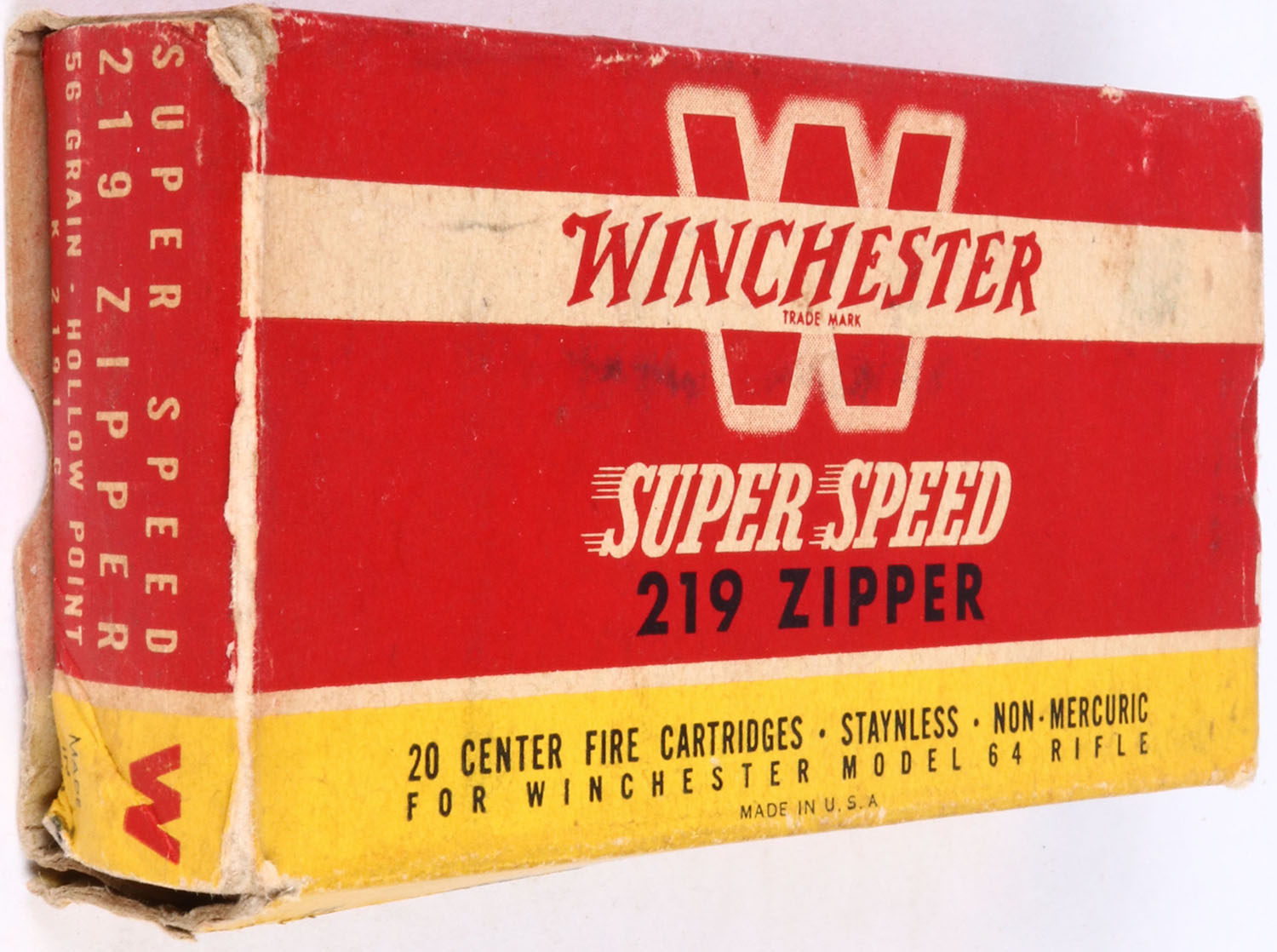 Winchester, .219 Zipper, Super Speed, 56 Gr. Hollow point Bullet, 1pc, Full, red & yellow box with white & black print, box is solid with light age soiling, handling wear, rub marks & edge wear, ammo is Excellent. Grade: Very Good ++ - Value: 250 to 500