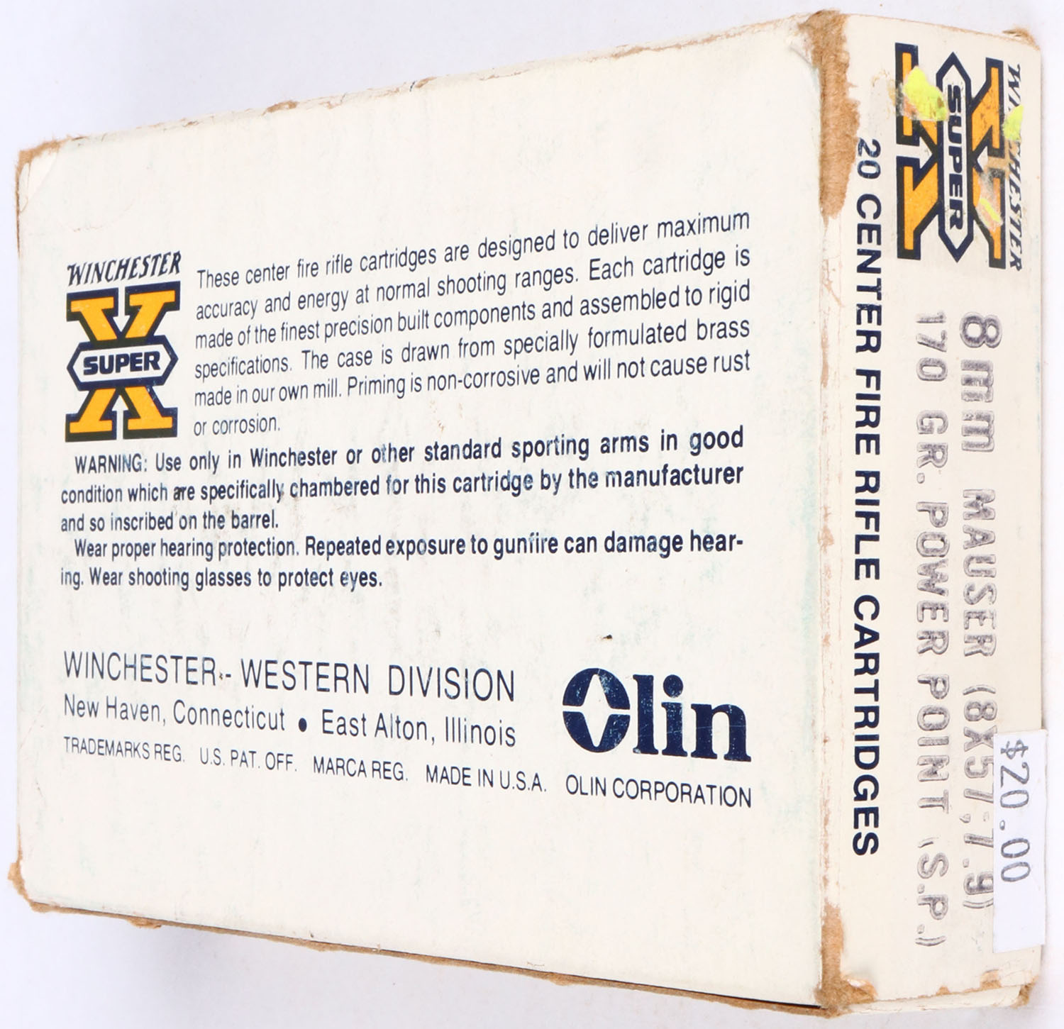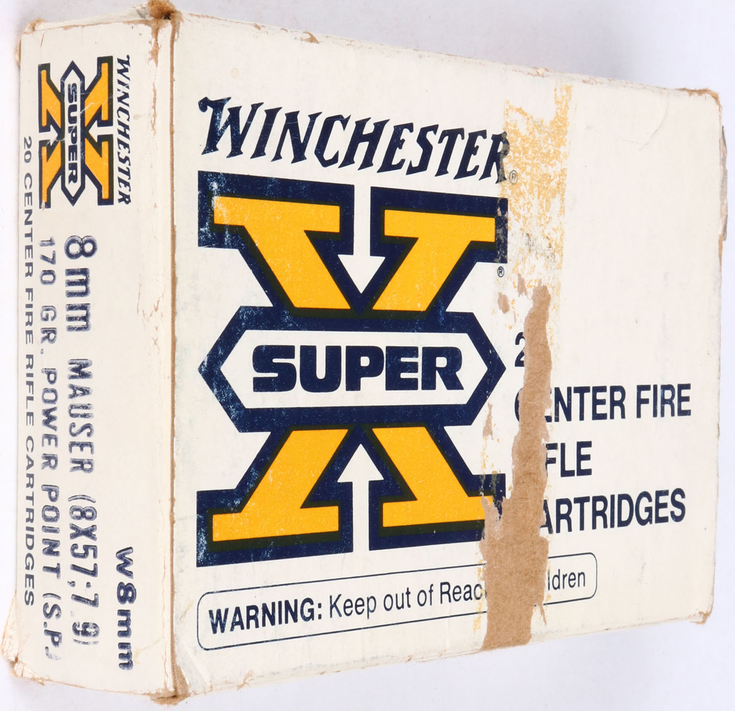 Winchester, Super-X, 8mm Mauser (8X57;7.9), 170 Gr. Power point Bullet, 1pc, Full with two ''FC'' rds., the rest are correct, white box with yellow/black print, box is solid with rip marks, rub marks, handling wear, & edge wear, ammo is excellent. Grade: Very Good ++ - Value: 20 to 40