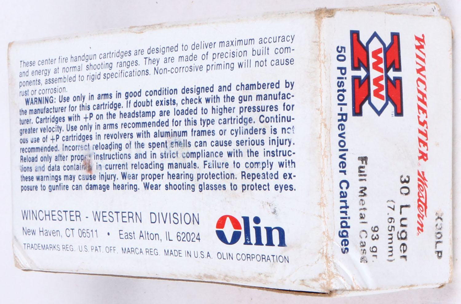 Winchester-Western, .30 Luger (7.65mm), 93 Gr. Full Metal case bullet, 1pc, Full, white box with black/red print, box is solid with rub marks & handling wear, ammo is excellent. Grade: Very Good ++ - Value: 40 to 80
