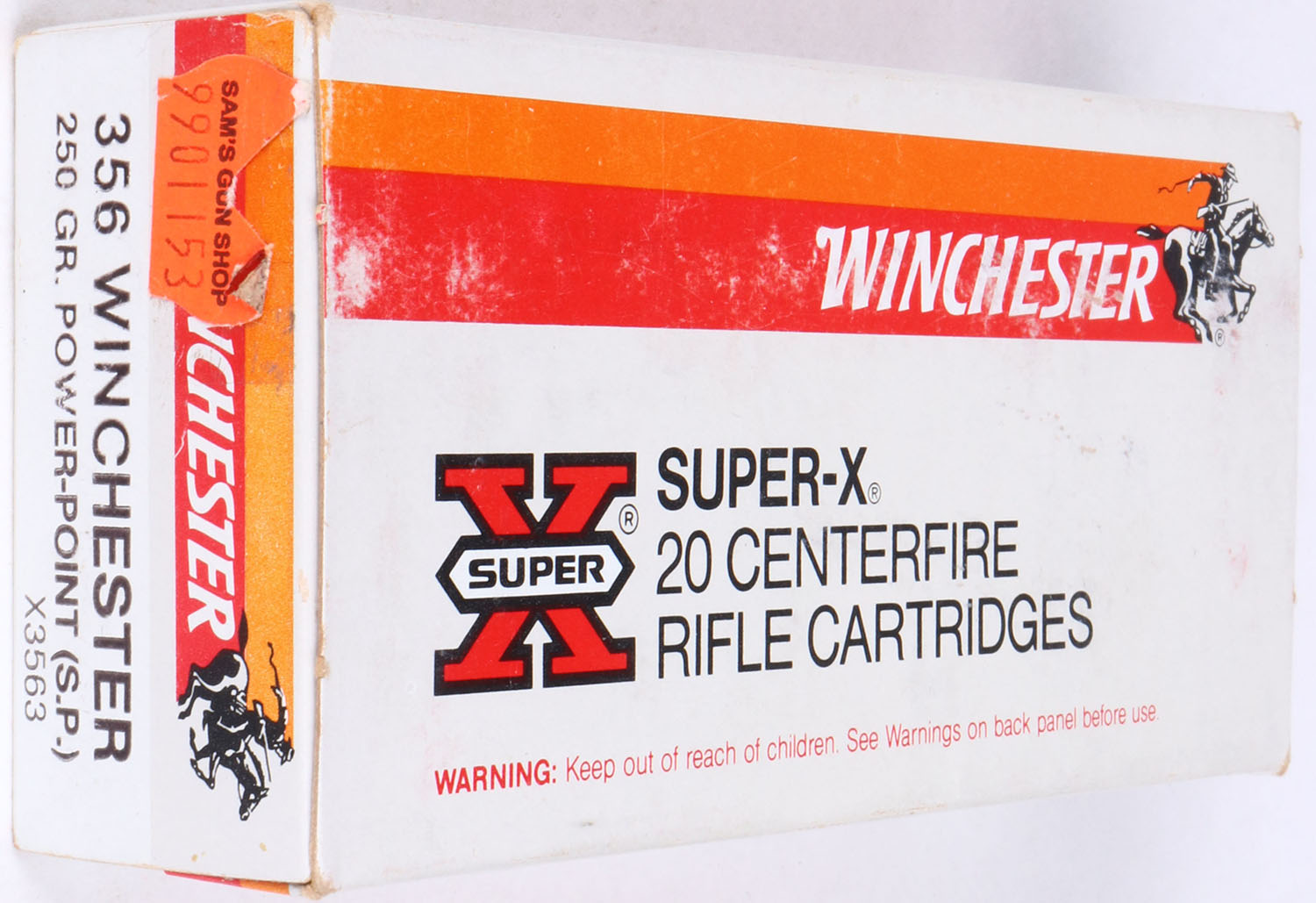 Winchester, Super-X, .356 Winchester, 250 Gr. Power Point (S.P.) bullet, 1pc, Full, white box with orange/red label & black/white print, box is solid with light wear & stickers, ammo is excellent. Grade: Excellent - Value: 30 to 90