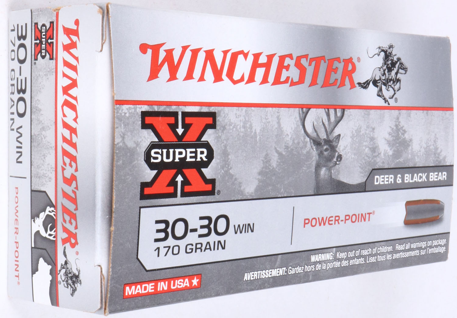 Winchester, Super-X, .30-30 Win., 170 Gr. Power Point bullet, 1pc, Full, gray box with black/red print, box is solid with light wear, ammo is excellent. Grade: Excellent - Value: 20 to 40