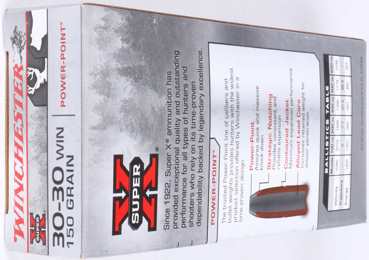 Winchester, Super-X, .30-30 Win., 150 Gr. Power Point bullet, 1pc, Full, gray box with black/red print, box is solid with light wear, ammo is excellent. Grade: Excellent - Value: 20 to 40