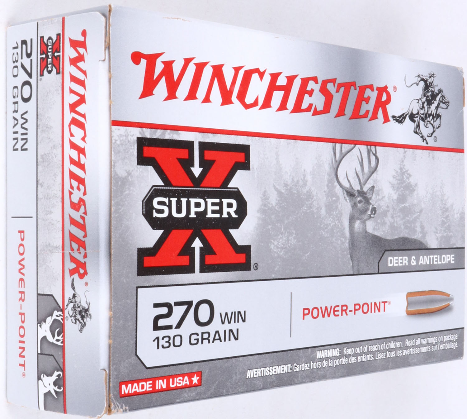 Winchester, Super-X, .270 Win., 130 Gr. Power Point bullet, 1pc, Full, gray box with black/red print, box is solid with light wear, ammo is excellent. Grade: Excellent - Value: 20 to 40