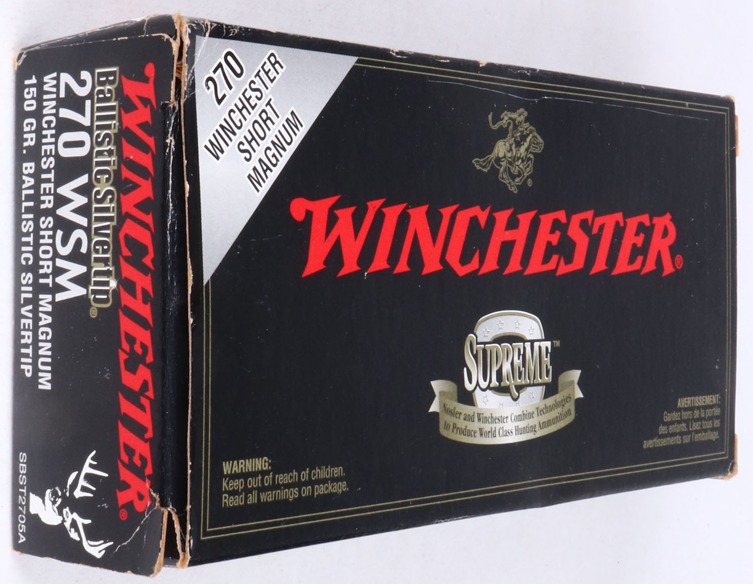 Winchester, Supreme, .270 WSM, 150 Gr. Ballistic silvertip bullet, 1pc, Full, black box with gold/red label & red/white print, box is solid with light wear, ammo is excellent. Grade: Excellent - Value: 30 to 90