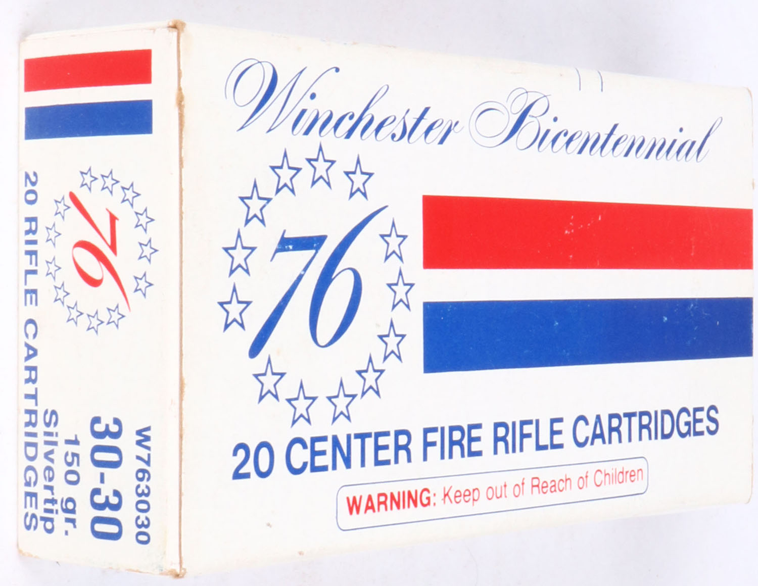 Winchester, Bicentennial, 30-30, 150 Grain Silvertip, Full, 1pc., Multi-colored box, box is solid with great color, Ammo is excellent. Grade: Excellent + - Value: 20 to 60