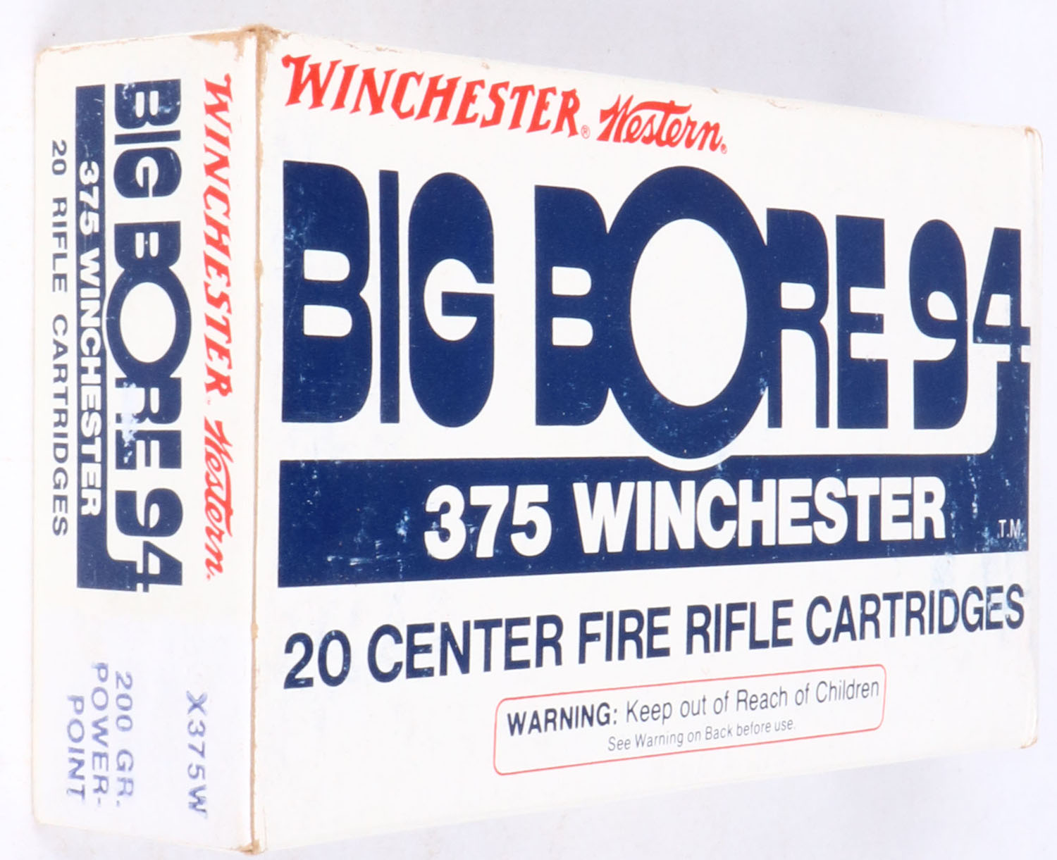 Winchester, Big Bore 94, 375 Win, 200 Grain Power Point, Full, 1pc., Multi-colored box, box is solid with great color, Ammo is excellent. Grade: Excellent + - Value: 60 to 120