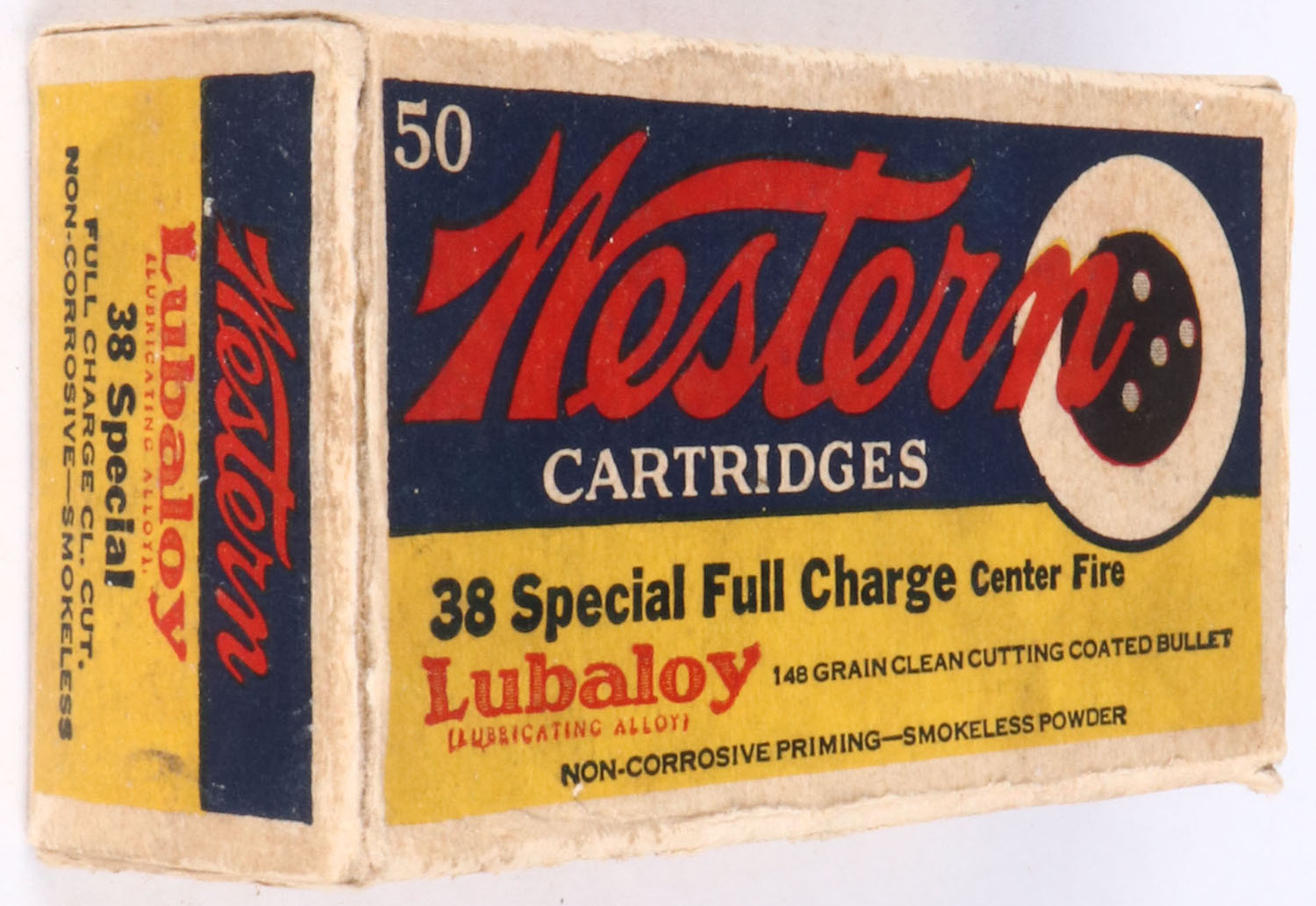 Western, Bullseye, .38 Special, 148 Gr. Lubaloy Clean cutting coated bullet, 1pc, Full, buff box with yellow/blue label & black/red/white print, box is solid with light age soiling, right end flap is detached, rub marks, & edge wear, ammo is very good. Grade: Very Good + - Value: 50 to 100